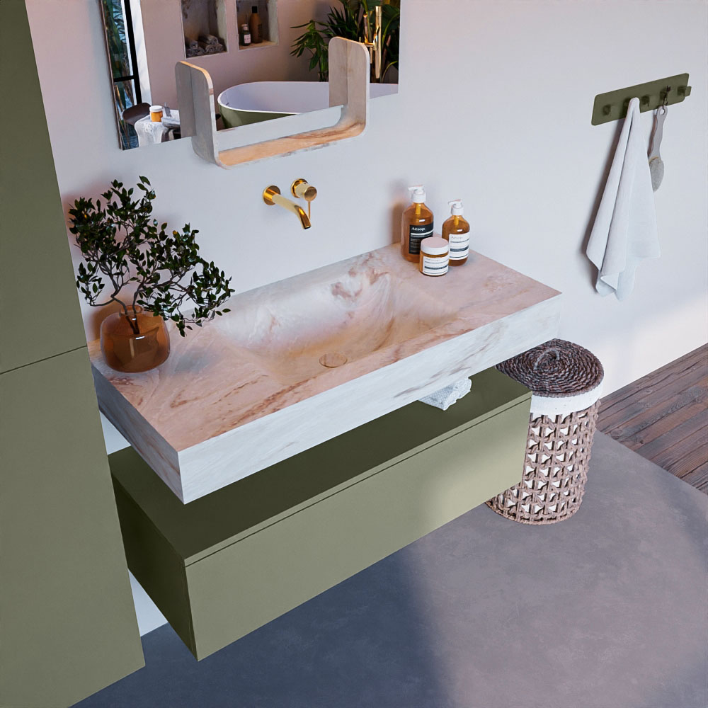 Cree un aspecto elegante y fantástico en su baño con el conjunto de muebles de baño Alan DLUX. El deslumbrante conjunto de muebles de baño ALAN-DLUX consta de un lavabo suspendido con suaves líneas orgánicas de CORIAN en Solid Surface marmolado combinado con el mueble de baño ALAN. El conjunto de muebles de baño ALAN-DLUX es adecuado para cualquier baño, ya sea pequeño o grande. Para completar completamente su baño, también hay disponibles varios accesorios en estos mármoles, como las repisas Mondiaz y los estantes de espejo.