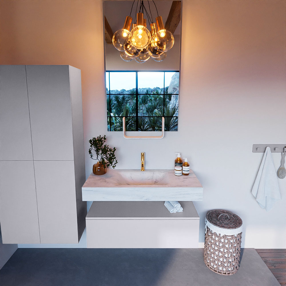 Cree un aspecto elegante y fantástico en su baño con el conjunto de muebles de baño Alan DLUX. El deslumbrante conjunto de muebles de baño ALAN-DLUX consta de un lavabo suspendido con suaves líneas orgánicas de CORIAN en Solid Surface marmolado combinado con el mueble de baño ALAN. El conjunto de muebles de baño ALAN-DLUX es adecuado para cualquier baño, ya sea pequeño o grande. Para completar completamente su baño, también hay disponibles varios accesorios en estos mármoles, como las repisas Mondiaz y los estantes de espejo.