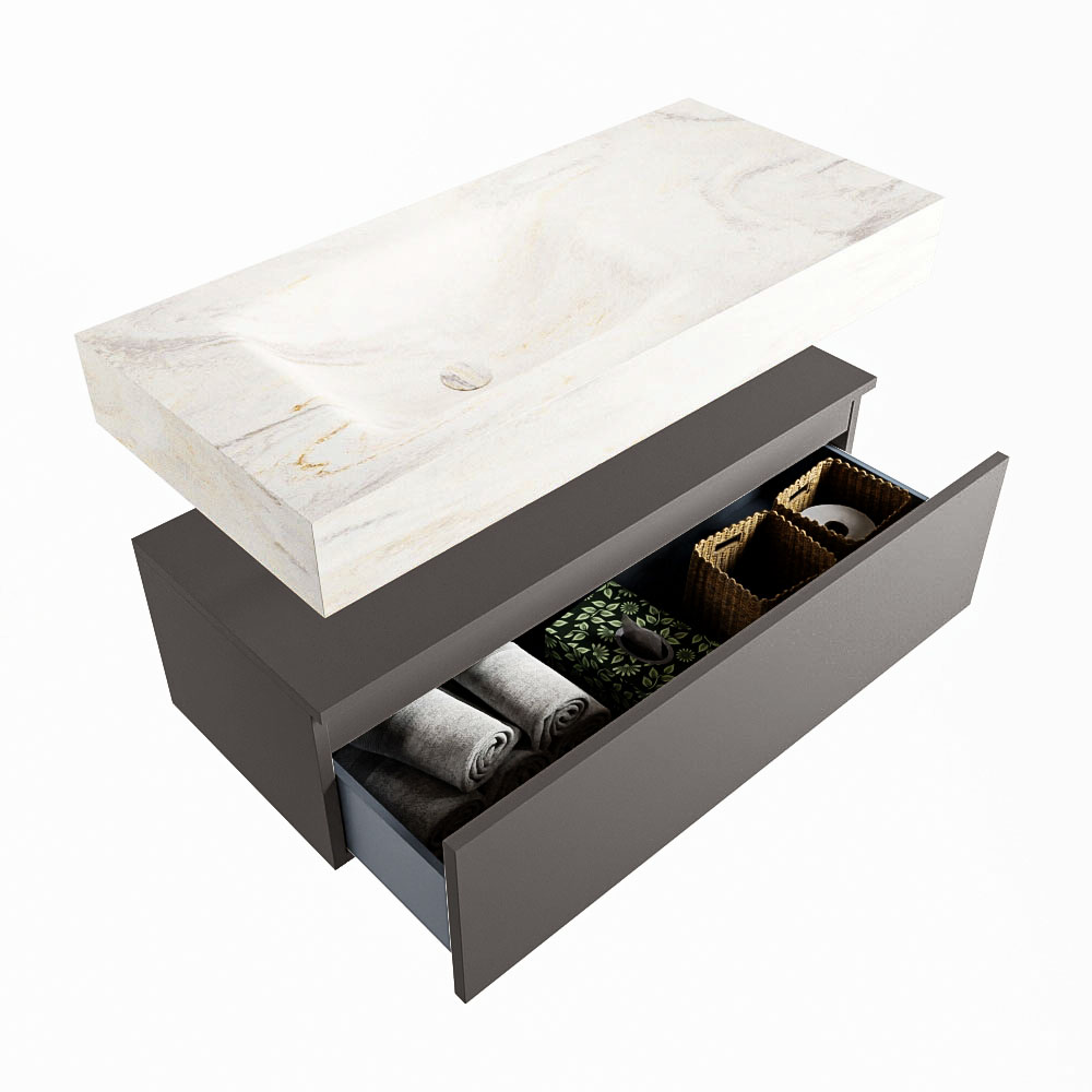 Cree un aspecto elegante y fantástico en su baño con el conjunto de muebles de baño Alan DLUX. El deslumbrante conjunto de muebles de baño ALAN-DLUX consta de un lavabo suspendido con suaves líneas orgánicas de CORIAN en Solid Surface marmolado combinado con el mueble de baño ALAN. El conjunto de muebles de baño ALAN-DLUX es adecuado para cualquier baño, ya sea pequeño o grande. Para completar completamente su baño, también hay disponibles varios accesorios en estos mármoles, como las repisas Mondiaz y los estantes de espejo.