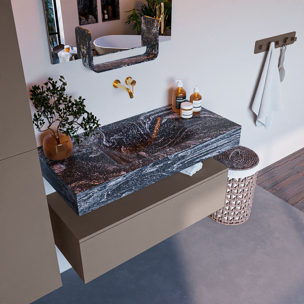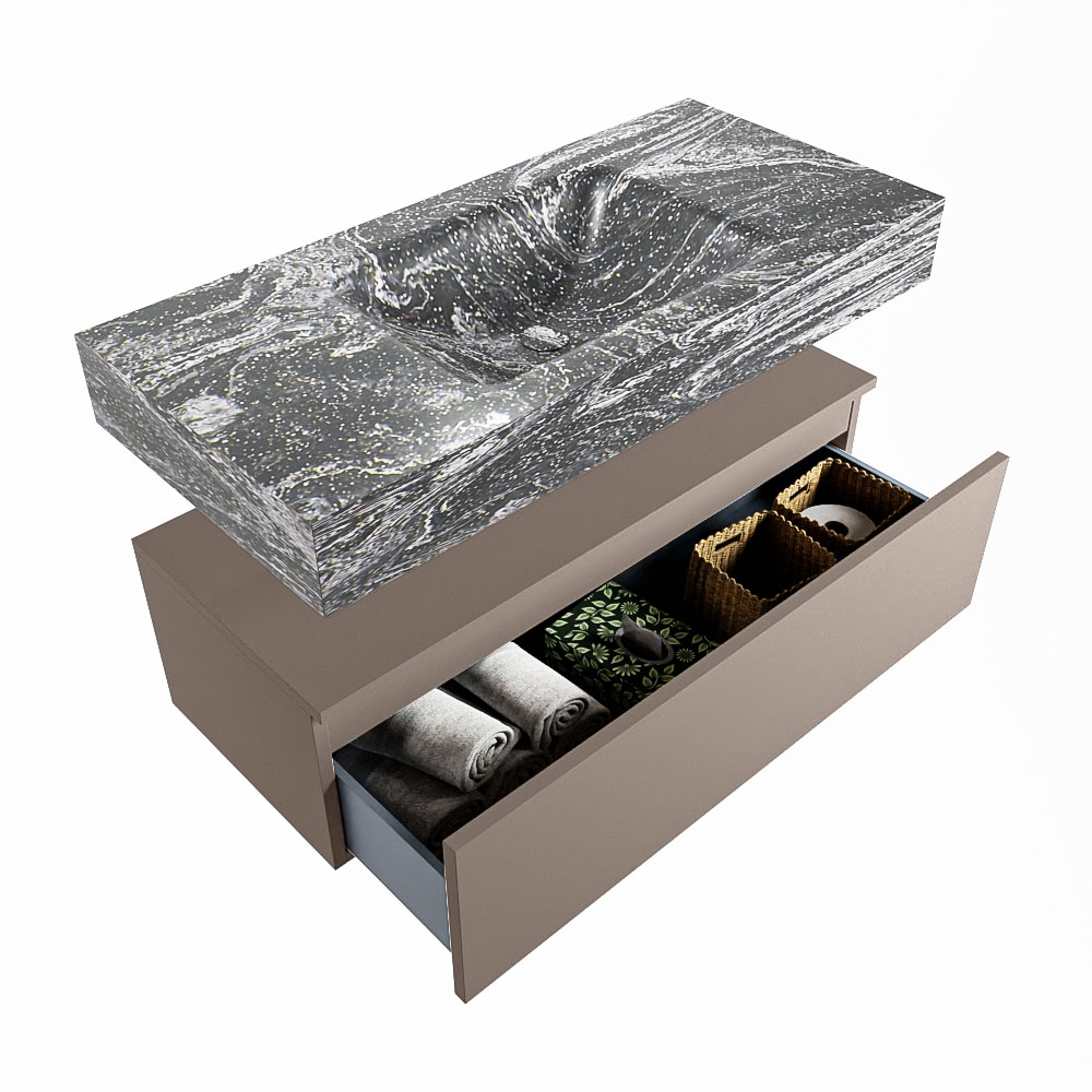 Cree un aspecto elegante y fantástico en su baño con el conjunto de muebles de baño Alan DLUX. El deslumbrante conjunto de muebles de baño ALAN-DLUX consta de un lavabo suspendido con suaves líneas orgánicas de CORIAN en Solid Surface marmolado combinado con el mueble de baño ALAN. El conjunto de muebles de baño ALAN-DLUX es adecuado para cualquier baño, ya sea pequeño o grande. Para completar completamente su baño, también hay disponibles varios accesorios en estos mármoles, como las repisas Mondiaz y los estantes de espejo.