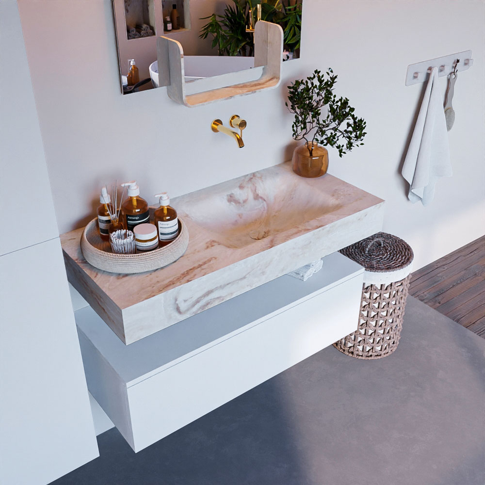 Cree un aspecto elegante y fantástico en su baño con el conjunto de muebles de baño Alan DLUX. El deslumbrante conjunto de muebles de baño ALAN-DLUX consta de un lavabo suspendido con suaves líneas orgánicas de CORIAN en Solid Surface marmolado combinado con el mueble de baño ALAN. El conjunto de muebles de baño ALAN-DLUX es adecuado para cualquier baño, ya sea pequeño o grande. Para completar completamente su baño, también hay disponibles varios accesorios en estos mármoles, como las repisas Mondiaz y los estantes de espejo.