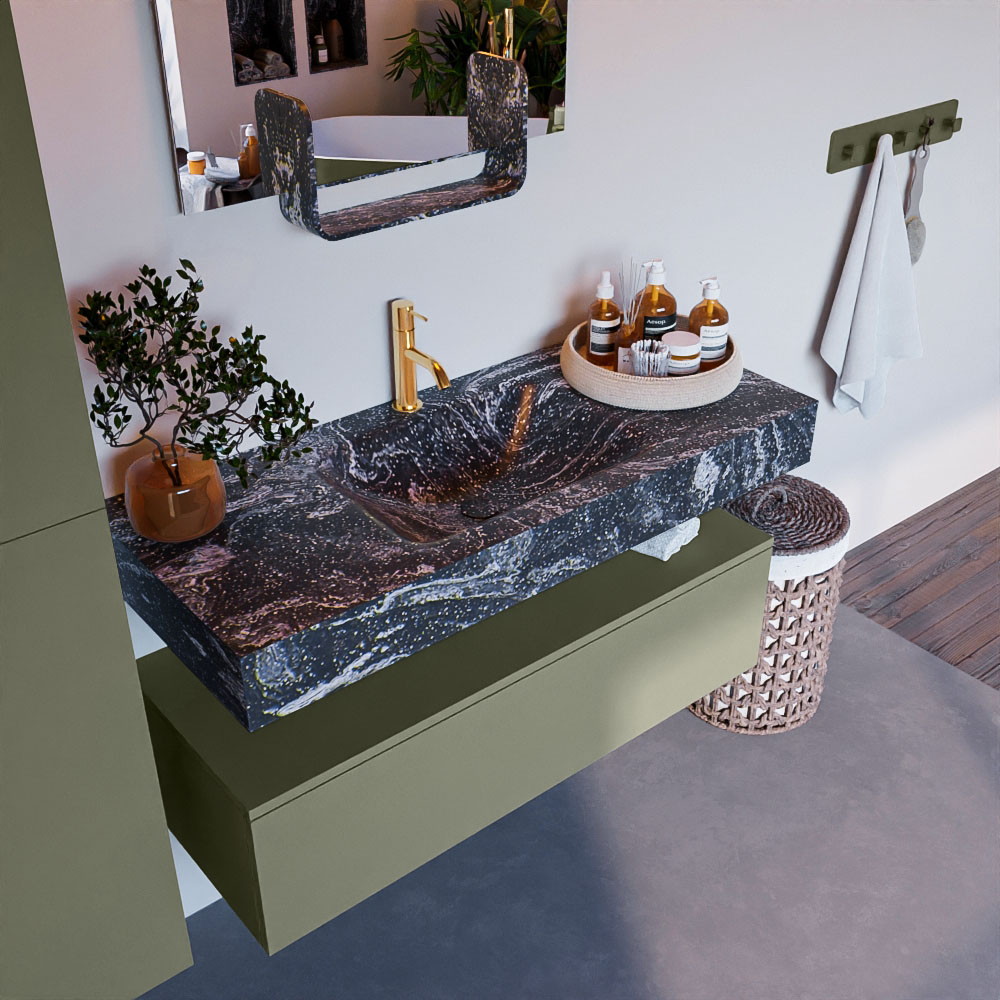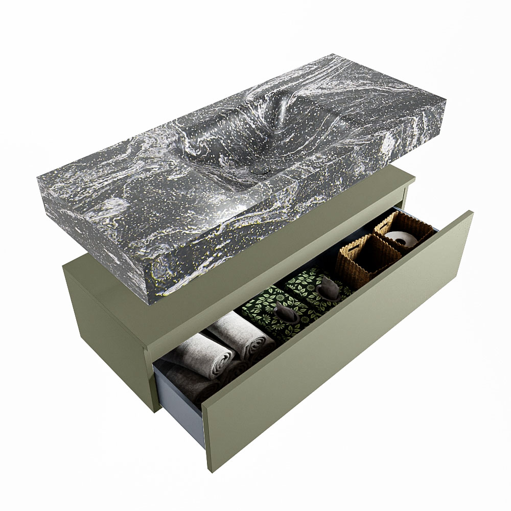 Cree un aspecto elegante y fantástico en su baño con el conjunto de muebles de baño Alan DLUX. El deslumbrante conjunto de muebles de baño ALAN-DLUX consta de un lavabo suspendido con suaves líneas orgánicas de CORIAN en Solid Surface marmolado combinado con el mueble de baño ALAN. El conjunto de muebles de baño ALAN-DLUX es adecuado para cualquier baño, ya sea pequeño o grande. Para completar completamente su baño, también hay disponibles varios accesorios en estos mármoles, como las repisas Mondiaz y los estantes de espejo.