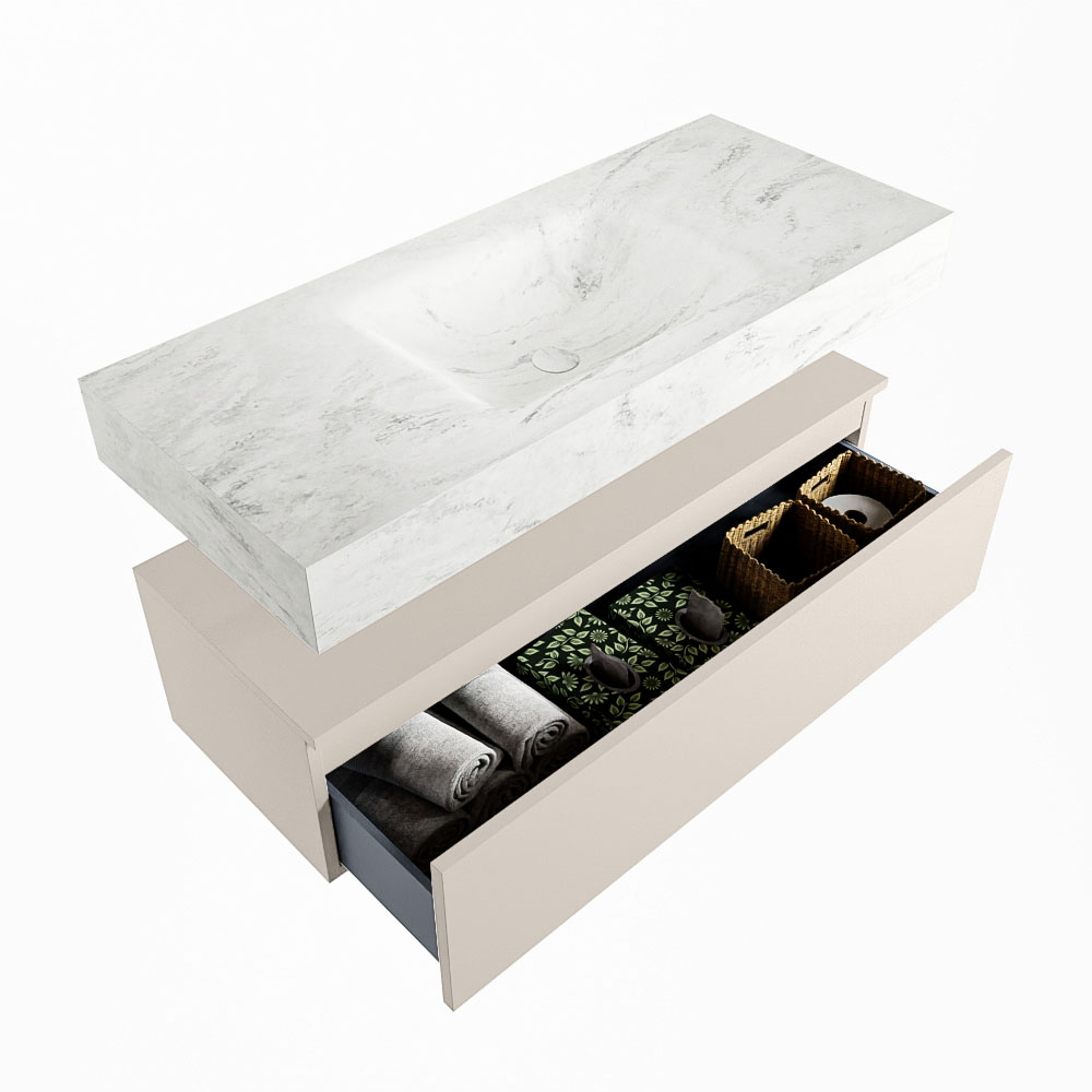 Cree un aspecto elegante y fantástico en su baño con el conjunto de muebles de baño Alan DLUX. El deslumbrante conjunto de muebles de baño ALAN-DLUX consta de un lavabo suspendido con suaves líneas orgánicas de CORIAN en Solid Surface marmolado combinado con el mueble de baño ALAN. El conjunto de muebles de baño ALAN-DLUX es adecuado para cualquier baño, ya sea pequeño o grande. Para completar completamente su baño, también hay disponibles varios accesorios en estos mármoles, como las repisas Mondiaz y los estantes de espejo.