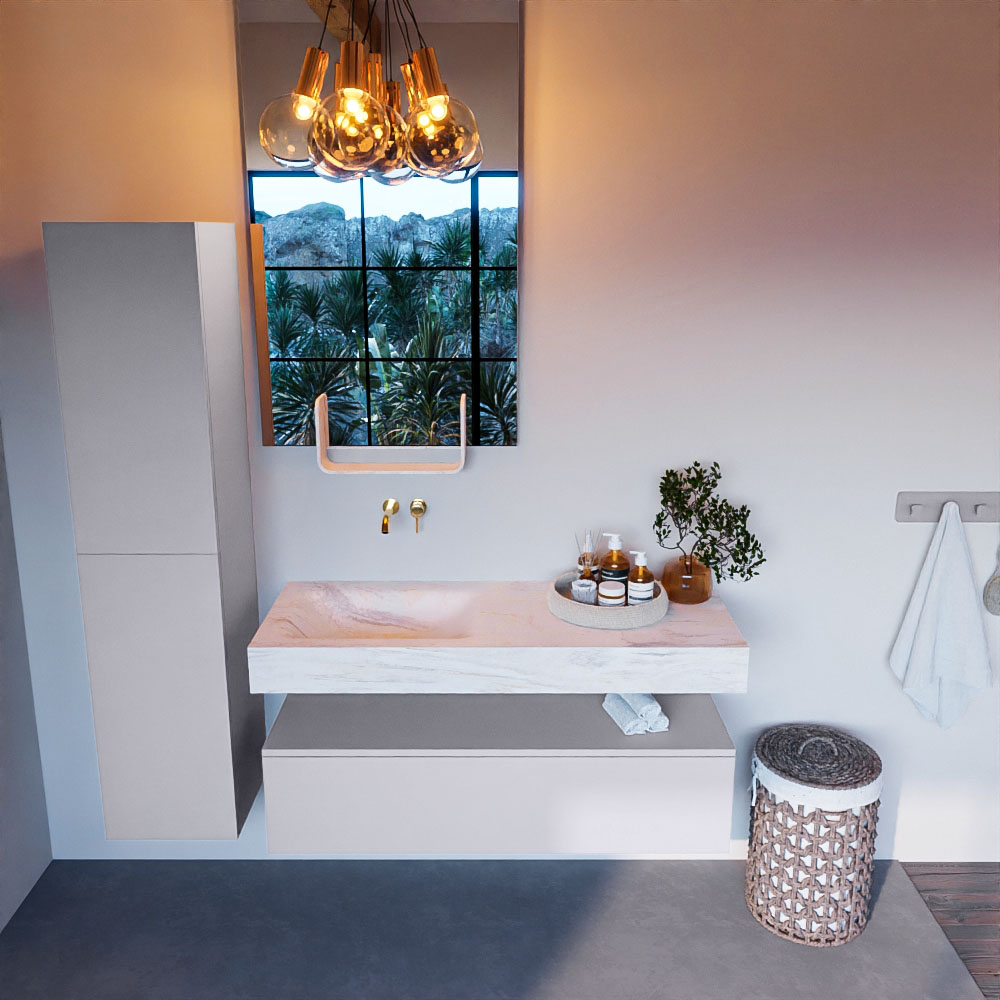 Cree un aspecto elegante y fantástico en su baño con el conjunto de muebles de baño Alan DLUX. El deslumbrante conjunto de muebles de baño ALAN-DLUX consta de un lavabo suspendido con suaves líneas orgánicas de CORIAN en Solid Surface marmolado combinado con el mueble de baño ALAN. El conjunto de muebles de baño ALAN-DLUX es adecuado para cualquier baño, ya sea pequeño o grande. Para completar completamente su baño, también hay disponibles varios accesorios en estos mármoles, como las repisas Mondiaz y los estantes de espejo.