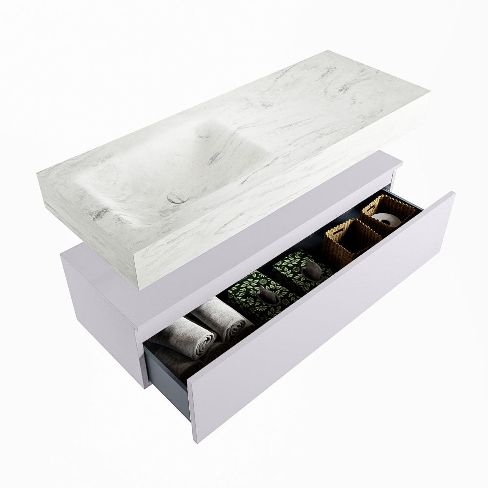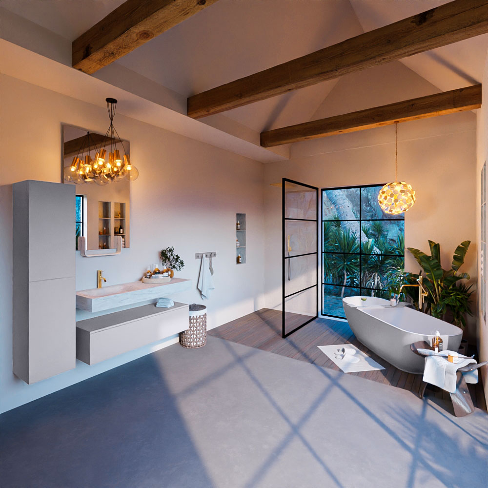 Cree un aspecto elegante y fantástico en su baño con el conjunto de muebles de baño Alan DLUX. El deslumbrante conjunto de muebles de baño ALAN-DLUX consta de un lavabo suspendido con suaves líneas orgánicas de CORIAN en Solid Surface marmolado combinado con el mueble de baño ALAN. El conjunto de muebles de baño ALAN-DLUX es adecuado para cualquier baño, ya sea pequeño o grande. Para completar completamente su baño, también hay disponibles varios accesorios en estos mármoles, como las repisas Mondiaz y los estantes de espejo.
