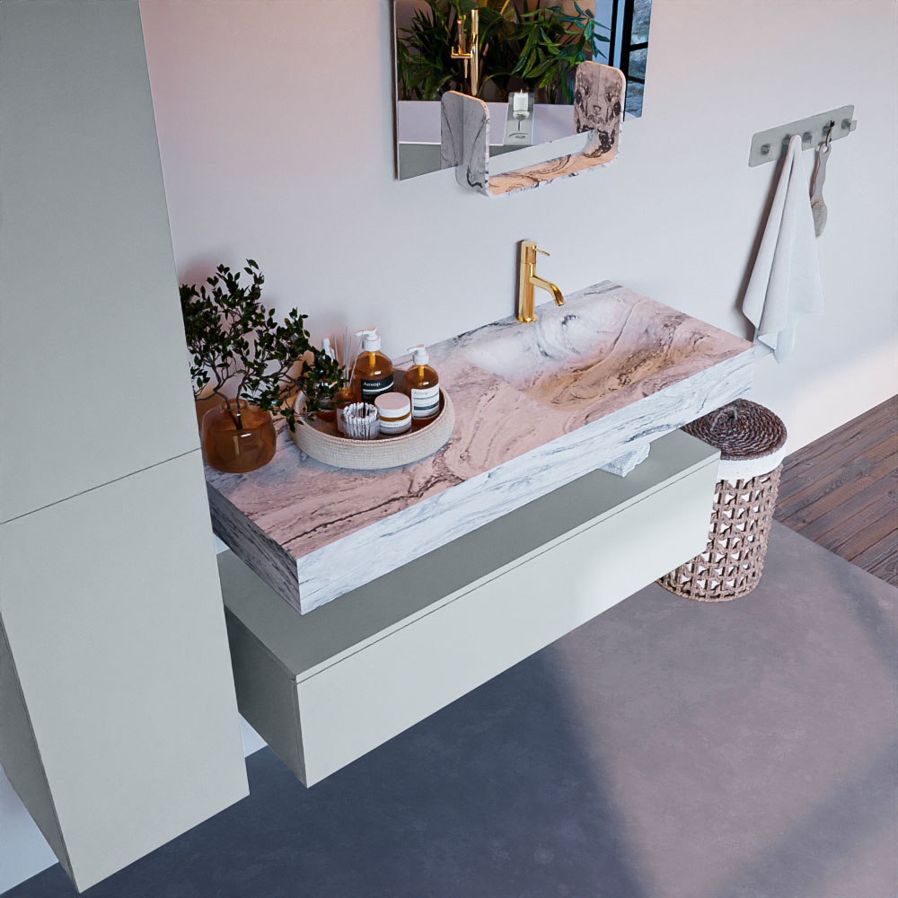 Cree un aspecto elegante y fantástico en su baño con el conjunto de muebles de baño Alan DLUX. El deslumbrante conjunto de muebles de baño ALAN-DLUX consta de un lavabo suspendido con suaves líneas orgánicas de CORIAN en Solid Surface marmolado combinado con el mueble de baño ALAN. El conjunto de muebles de baño ALAN-DLUX es adecuado para cualquier baño, ya sea pequeño o grande. Para completar completamente su baño, también hay disponibles varios accesorios en estos mármoles, como las repisas Mondiaz y los estantes de espejo.