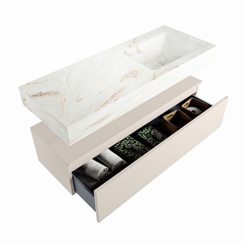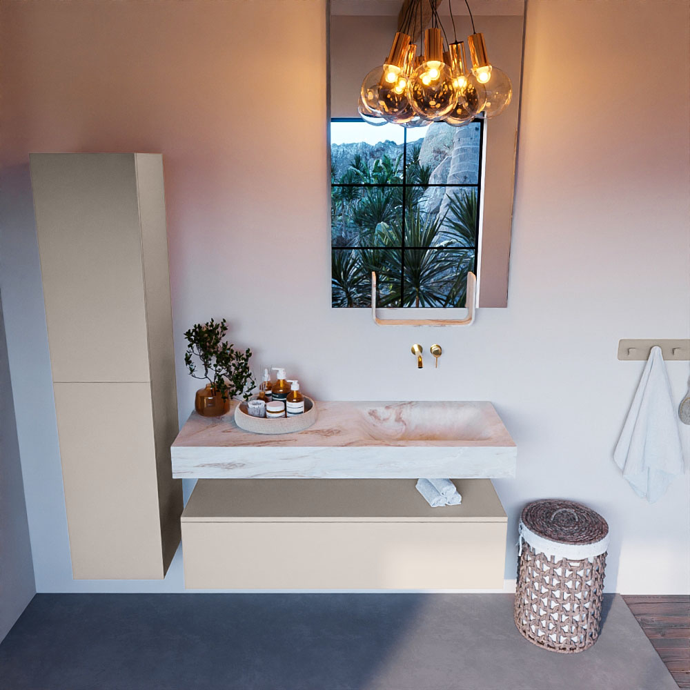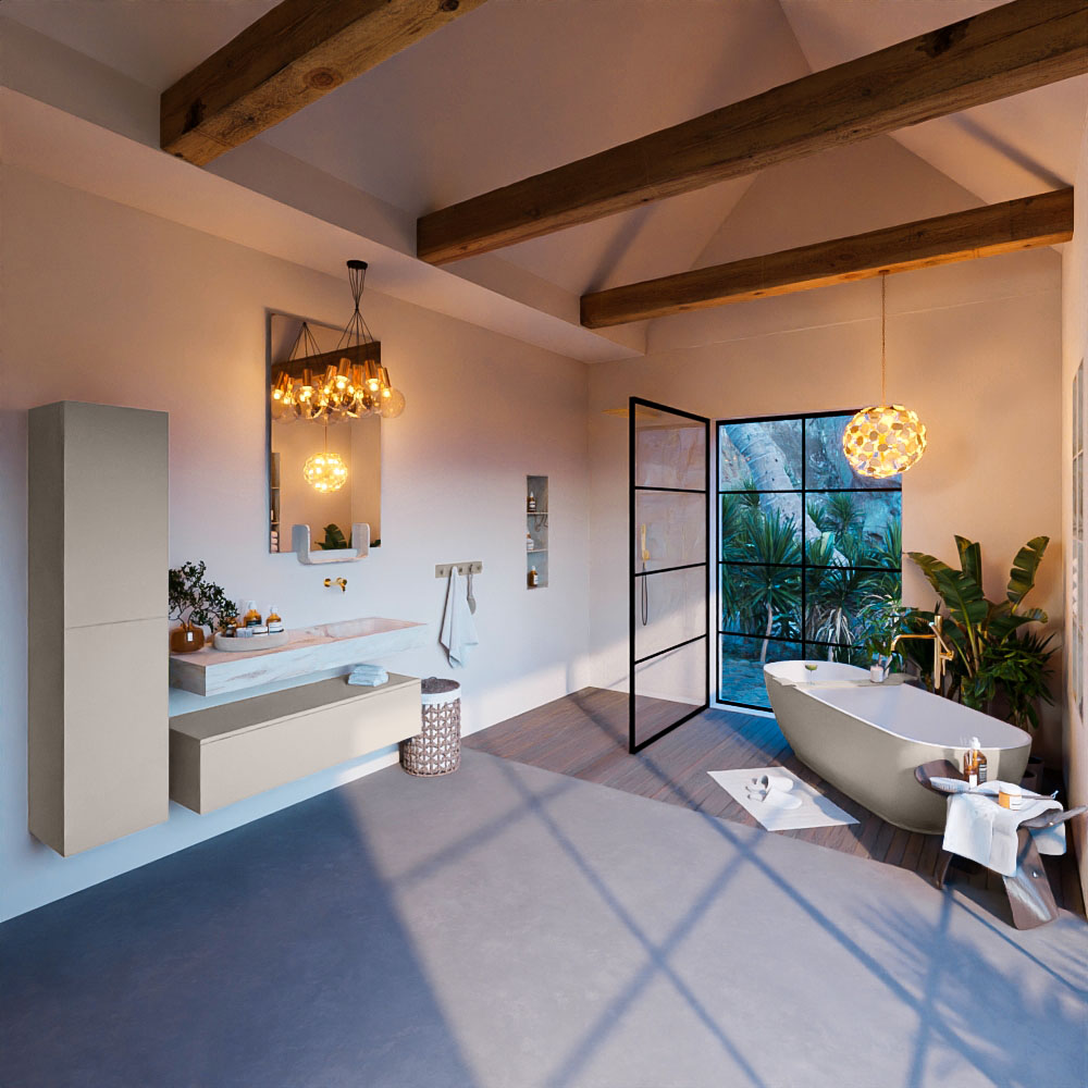 Cree un aspecto elegante y fantástico en su baño con el conjunto de muebles de baño Alan DLUX. El deslumbrante conjunto de muebles de baño ALAN-DLUX consta de un lavabo suspendido con suaves líneas orgánicas de CORIAN en Solid Surface marmolado combinado con el mueble de baño ALAN. El conjunto de muebles de baño ALAN-DLUX es adecuado para cualquier baño, ya sea pequeño o grande. Para completar completamente su baño, también hay disponibles varios accesorios en estos mármoles, como las repisas Mondiaz y los estantes de espejo.