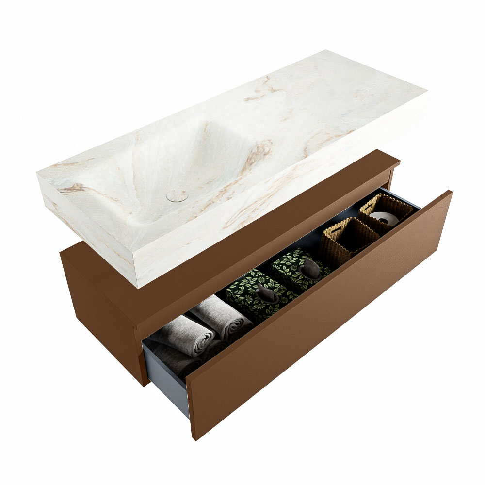 Cree un aspecto elegante y fantástico en su baño con el conjunto de muebles de baño Alan DLUX. El deslumbrante conjunto de muebles de baño ALAN-DLUX consta de un lavabo suspendido con suaves líneas orgánicas de CORIAN en Solid Surface marmolado combinado con el mueble de baño ALAN. El conjunto de muebles de baño ALAN-DLUX es adecuado para cualquier baño, ya sea pequeño o grande. Para completar completamente su baño, también hay disponibles varios accesorios en estos mármoles, como las repisas Mondiaz y los estantes de espejo.