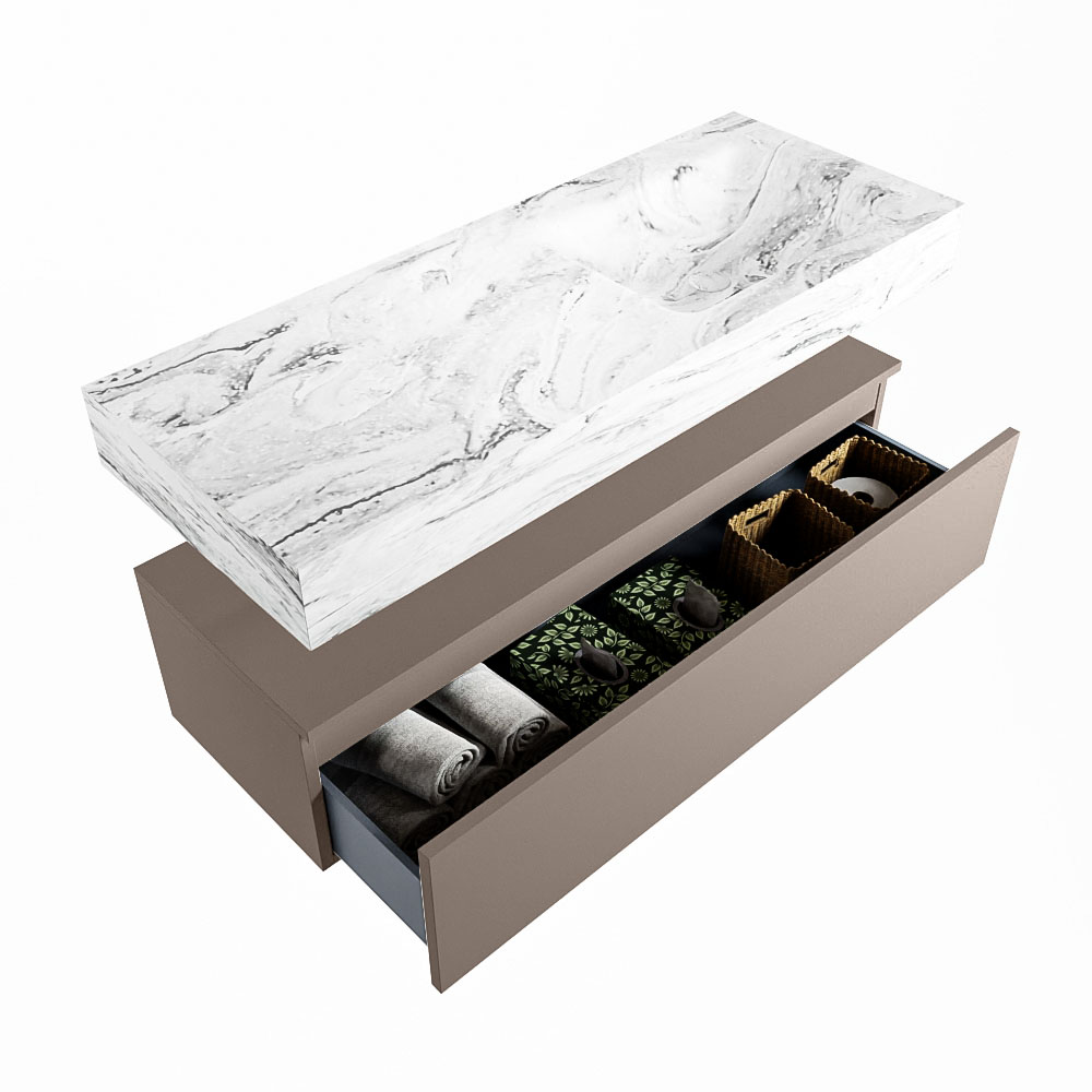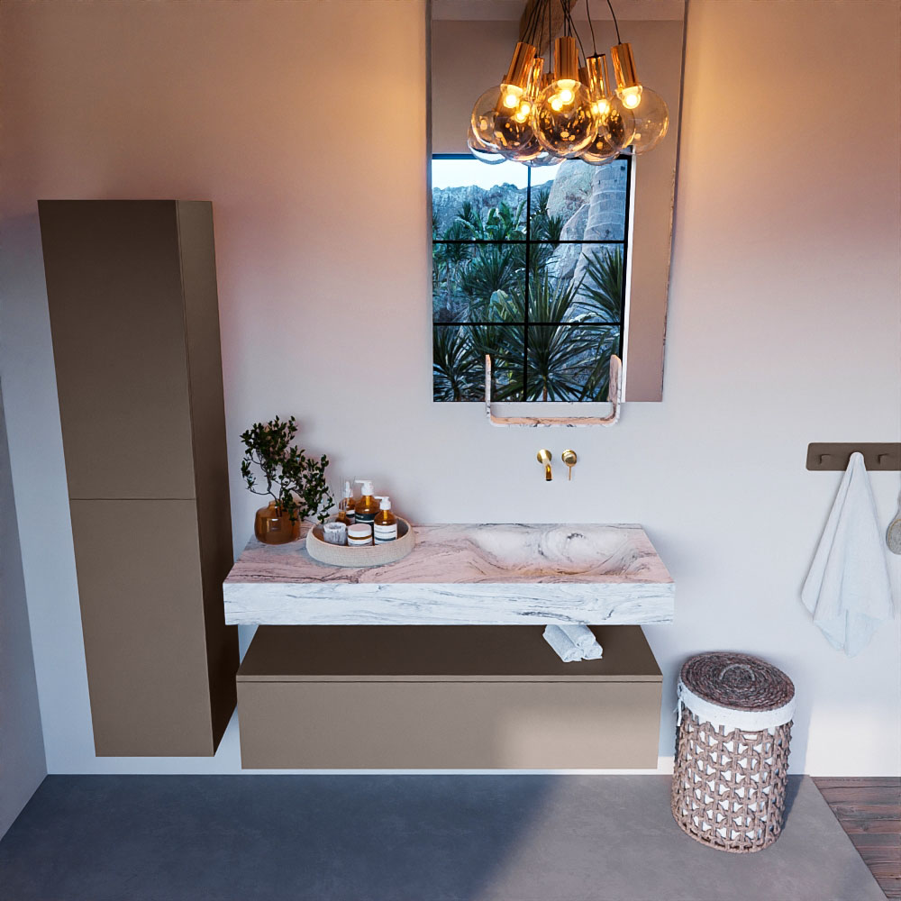 Cree un aspecto elegante y fantástico en su baño con el conjunto de muebles de baño Alan DLUX. El deslumbrante conjunto de muebles de baño ALAN-DLUX consta de un lavabo suspendido con suaves líneas orgánicas de CORIAN en Solid Surface marmolado combinado con el mueble de baño ALAN. El conjunto de muebles de baño ALAN-DLUX es adecuado para cualquier baño, ya sea pequeño o grande. Para completar completamente su baño, también hay disponibles varios accesorios en estos mármoles, como las repisas Mondiaz y los estantes de espejo.