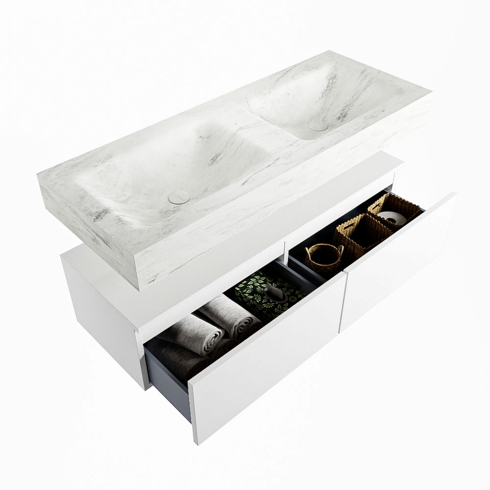 Cree un aspecto elegante y fantástico en su baño con el conjunto de muebles de baño Alan DLUX. El deslumbrante conjunto de muebles de baño ALAN-DLUX consta de un lavabo suspendido con suaves líneas orgánicas de CORIAN en Solid Surface marmolado combinado con el mueble de baño ALAN. El conjunto de muebles de baño ALAN-DLUX es adecuado para cualquier baño, ya sea pequeño o grande. Para completar completamente su baño, también hay disponibles varios accesorios en estos mármoles, como las repisas Mondiaz y los estantes de espejo.