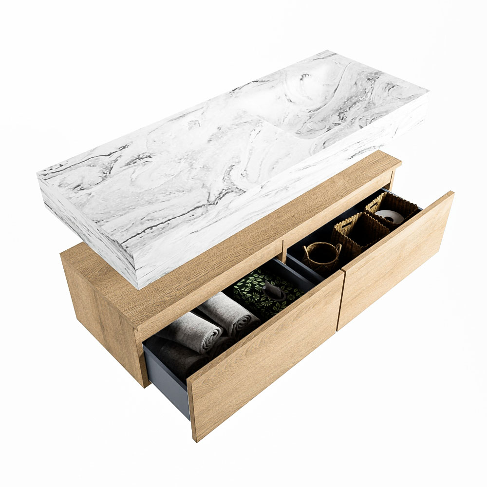Cree un aspecto elegante y fantástico en su baño con el conjunto de muebles de baño Alan DLUX. El deslumbrante conjunto de muebles de baño ALAN-DLUX consta de un lavabo suspendido con suaves líneas orgánicas de CORIAN en Solid Surface marmolado combinado con el mueble de baño ALAN. El conjunto de muebles de baño ALAN-DLUX es adecuado para cualquier baño, ya sea pequeño o grande. Para completar completamente su baño, también hay disponibles varios accesorios en estos mármoles, como las repisas Mondiaz y los estantes de espejo.