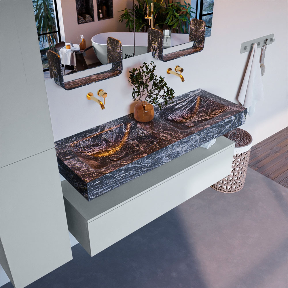 Cree un aspecto elegante y fantástico en su baño con el conjunto de muebles de baño Alan DLUX. El deslumbrante conjunto de muebles de baño ALAN-DLUX consta de un lavabo suspendido con suaves líneas orgánicas de CORIAN en Solid Surface marmolado combinado con el mueble de baño ALAN. El conjunto de muebles de baño ALAN-DLUX es adecuado para cualquier baño, ya sea pequeño o grande. Para completar completamente su baño, también hay disponibles varios accesorios en estos mármoles, como las repisas Mondiaz y los estantes de espejo.