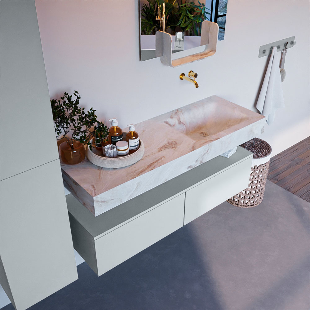 Cree un aspecto elegante y fantástico en su baño con el conjunto de muebles de baño Alan DLUX. El deslumbrante conjunto de muebles de baño ALAN-DLUX consta de un lavabo suspendido con suaves líneas orgánicas de CORIAN en Solid Surface marmolado combinado con el mueble de baño ALAN. El conjunto de muebles de baño ALAN-DLUX es adecuado para cualquier baño, ya sea pequeño o grande. Para completar completamente su baño, también hay disponibles varios accesorios en estos mármoles, como las repisas Mondiaz y los estantes de espejo.