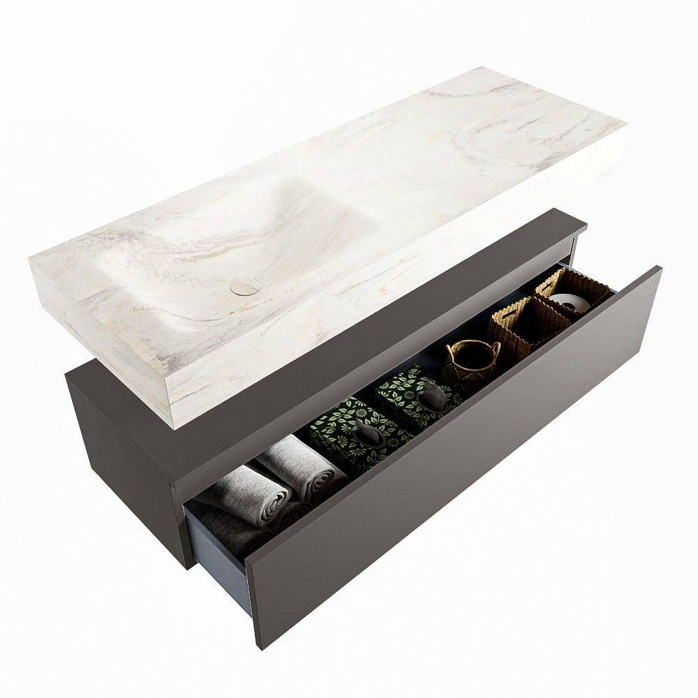 Cree un aspecto elegante y fantástico en su baño con el conjunto de muebles de baño Alan DLUX. El deslumbrante conjunto de muebles de baño ALAN-DLUX consta de un lavabo suspendido con suaves líneas orgánicas de CORIAN en Solid Surface marmolado combinado con el mueble de baño ALAN. El conjunto de muebles de baño ALAN-DLUX es adecuado para cualquier baño, ya sea pequeño o grande. Para completar completamente su baño, también hay disponibles varios accesorios en estos mármoles, como las repisas Mondiaz y los estantes de espejo.