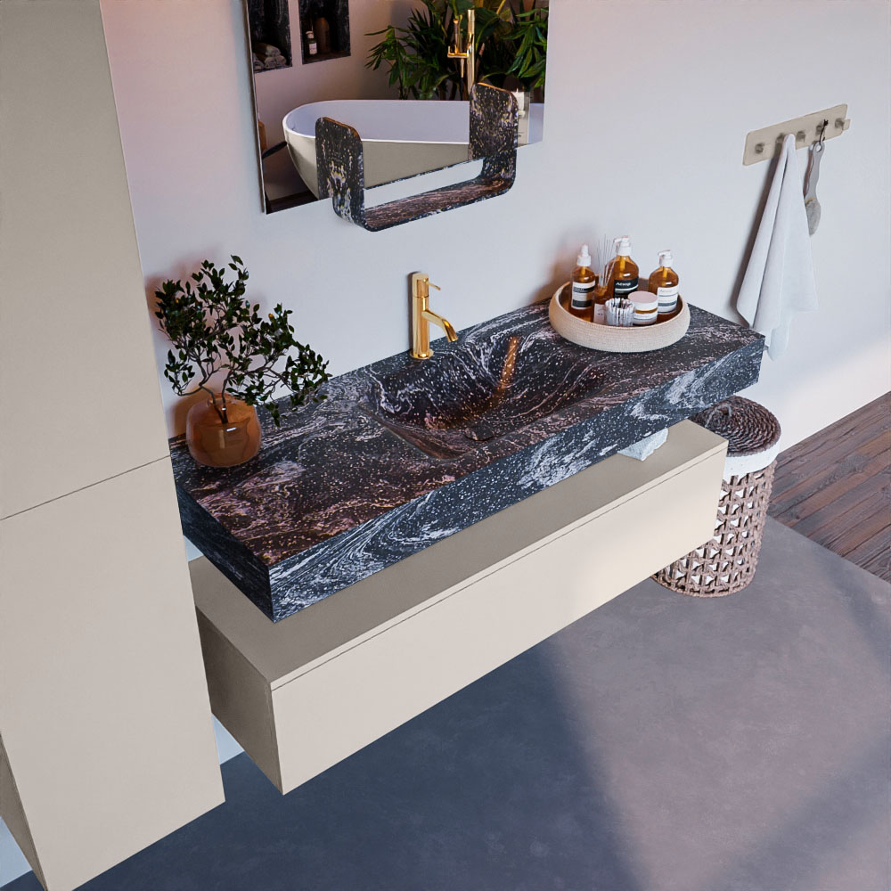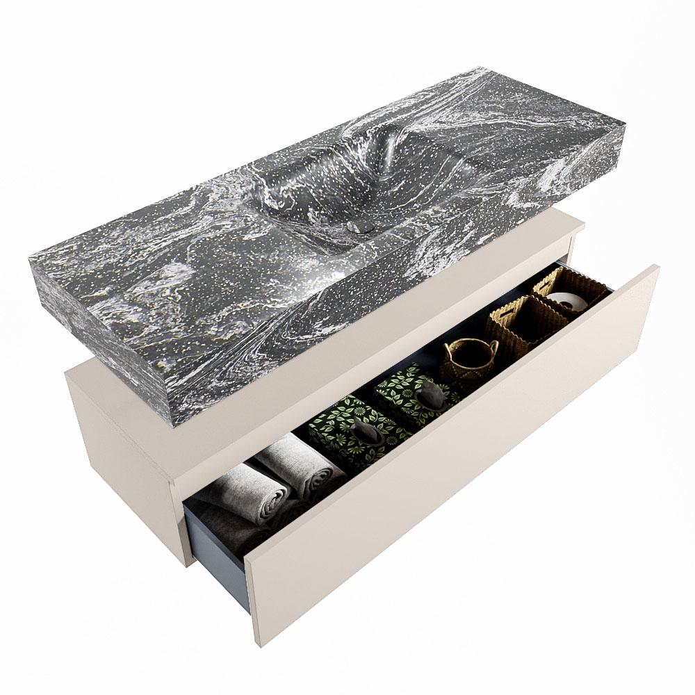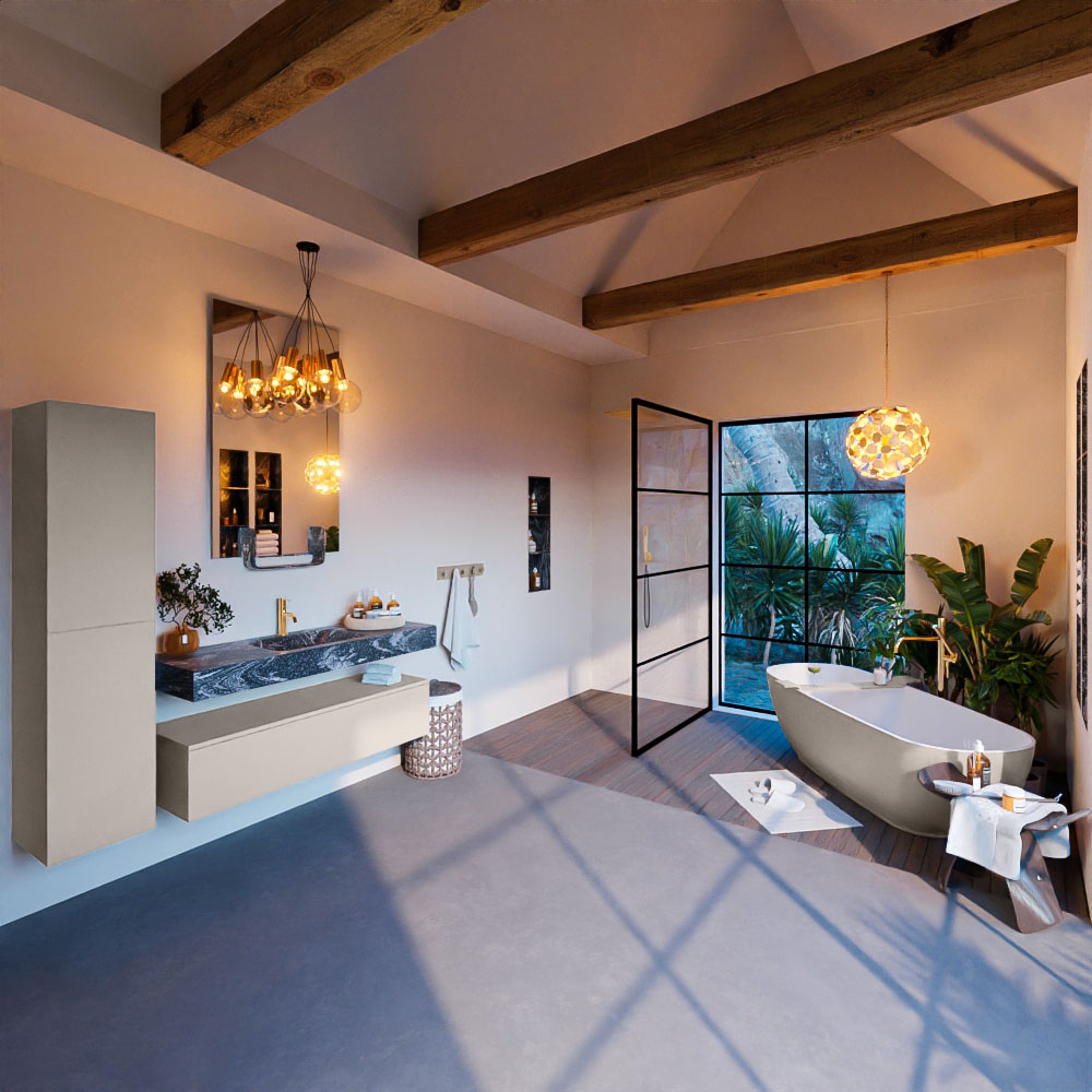 Cree un aspecto elegante y fantástico en su baño con el conjunto de muebles de baño Alan DLUX. El deslumbrante conjunto de muebles de baño ALAN-DLUX consta de un lavabo suspendido con suaves líneas orgánicas de CORIAN en Solid Surface marmolado combinado con el mueble de baño ALAN. El conjunto de muebles de baño ALAN-DLUX es adecuado para cualquier baño, ya sea pequeño o grande. Para completar completamente su baño, también hay disponibles varios accesorios en estos mármoles, como las repisas Mondiaz y los estantes de espejo.