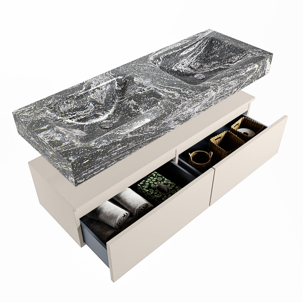 Cree un aspecto elegante y fantástico en su baño con el conjunto de muebles de baño Alan DLUX. El deslumbrante conjunto de muebles de baño ALAN-DLUX consta de un lavabo suspendido con suaves líneas orgánicas de CORIAN en Solid Surface marmolado combinado con el mueble de baño ALAN. El conjunto de muebles de baño ALAN-DLUX es adecuado para cualquier baño, ya sea pequeño o grande. Para completar completamente su baño, también hay disponibles varios accesorios en estos mármoles, como las repisas Mondiaz y los estantes de espejo.