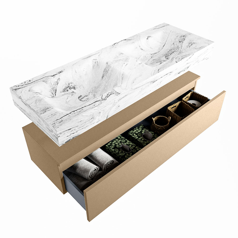 Cree un aspecto elegante y fantástico en su baño con el conjunto de muebles de baño Alan DLUX. El deslumbrante conjunto de muebles de baño ALAN-DLUX consta de un lavabo suspendido con suaves líneas orgánicas de CORIAN en Solid Surface marmolado combinado con el mueble de baño ALAN. El conjunto de muebles de baño ALAN-DLUX es adecuado para cualquier baño, ya sea pequeño o grande. Para completar completamente su baño, también hay disponibles varios accesorios en estos mármoles, como las repisas Mondiaz y los estantes de espejo.