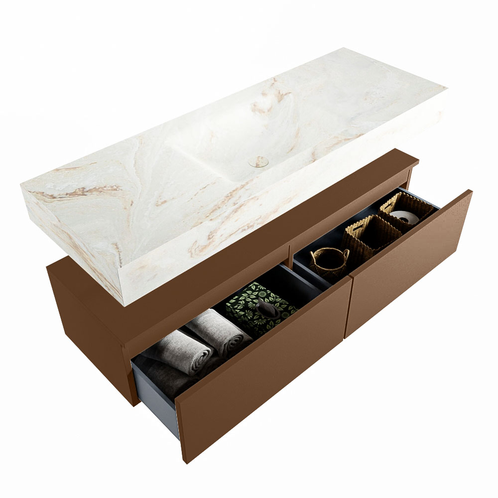 Cree un aspecto elegante y fantástico en su baño con el conjunto de muebles de baño Alan DLUX. El deslumbrante conjunto de muebles de baño ALAN-DLUX consta de un lavabo suspendido con suaves líneas orgánicas de CORIAN en Solid Surface marmolado combinado con el mueble de baño ALAN. El conjunto de muebles de baño ALAN-DLUX es adecuado para cualquier baño, ya sea pequeño o grande. Para completar completamente su baño, también hay disponibles varios accesorios en estos mármoles, como las repisas Mondiaz y los estantes de espejo.