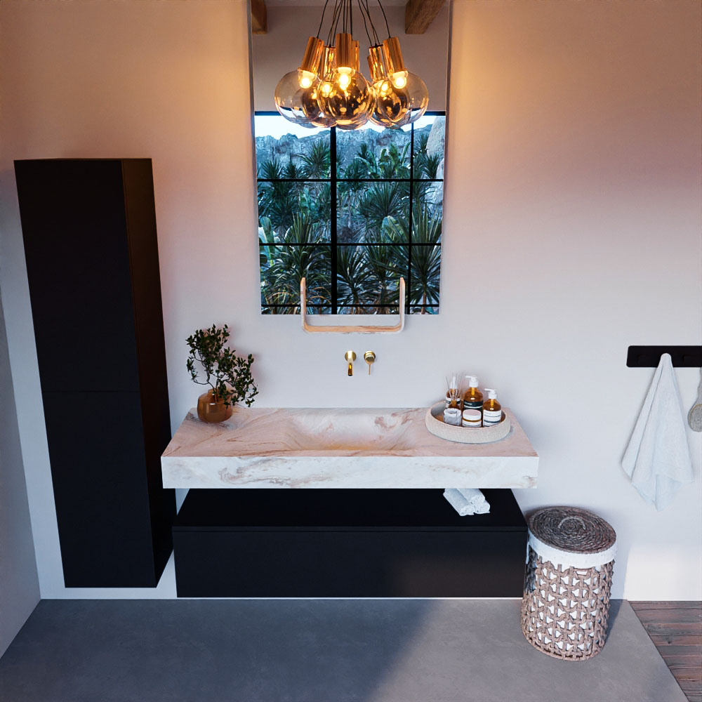 Cree un aspecto elegante y fantástico en su baño con el conjunto de muebles de baño Alan DLUX. El deslumbrante conjunto de muebles de baño ALAN-DLUX consta de un lavabo suspendido con suaves líneas orgánicas de CORIAN en Solid Surface marmolado combinado con el mueble de baño ALAN. El conjunto de muebles de baño ALAN-DLUX es adecuado para cualquier baño, ya sea pequeño o grande. Para completar completamente su baño, también hay disponibles varios accesorios en estos mármoles, como las repisas Mondiaz y los estantes de espejo.