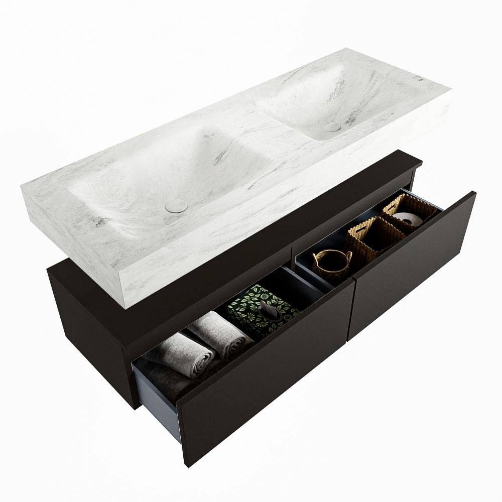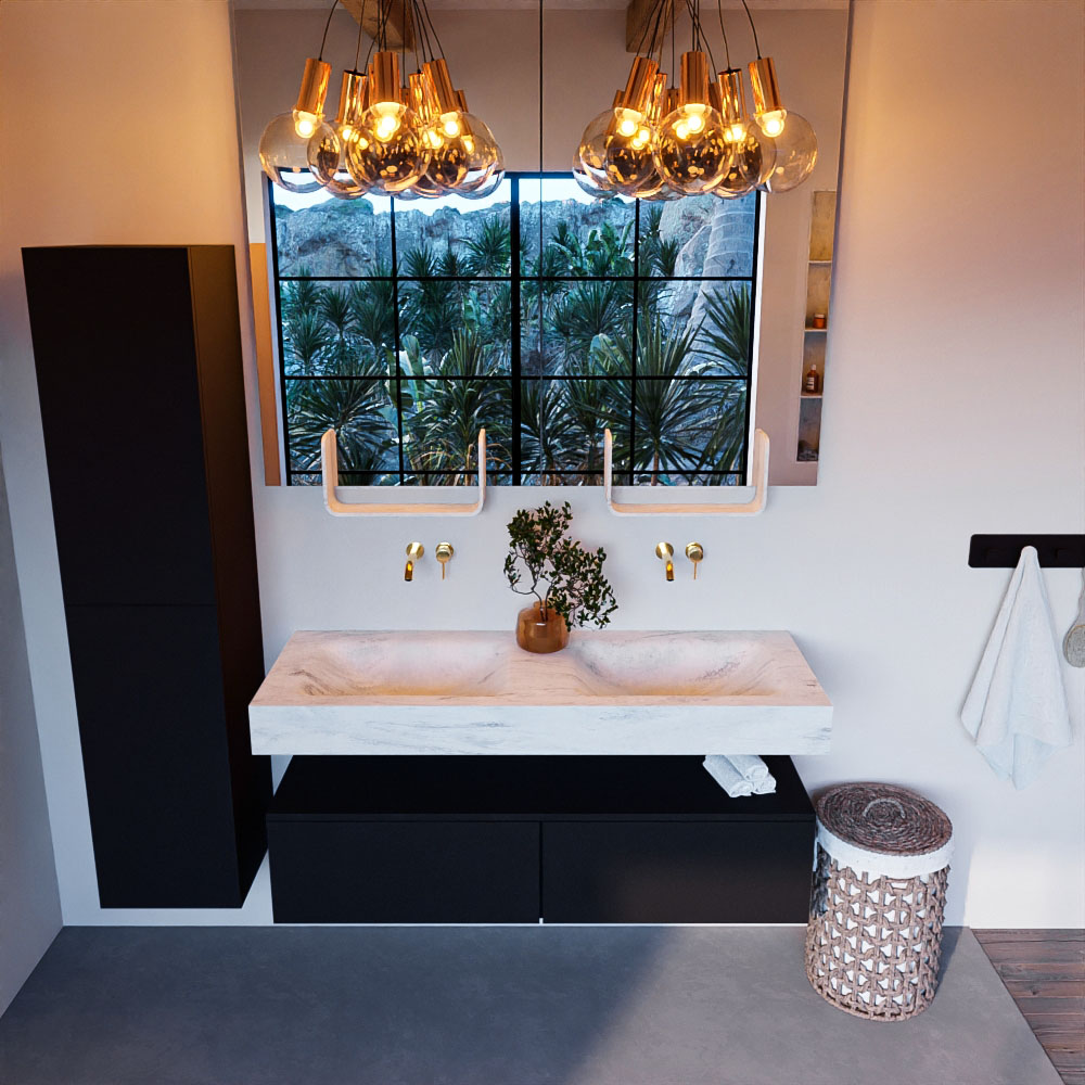 Cree un aspecto elegante y fantástico en su baño con el conjunto de muebles de baño Alan DLUX. El deslumbrante conjunto de muebles de baño ALAN-DLUX consta de un lavabo suspendido con suaves líneas orgánicas de CORIAN en Solid Surface marmolado combinado con el mueble de baño ALAN. El conjunto de muebles de baño ALAN-DLUX es adecuado para cualquier baño, ya sea pequeño o grande. Para completar completamente su baño, también hay disponibles varios accesorios en estos mármoles, como las repisas Mondiaz y los estantes de espejo.