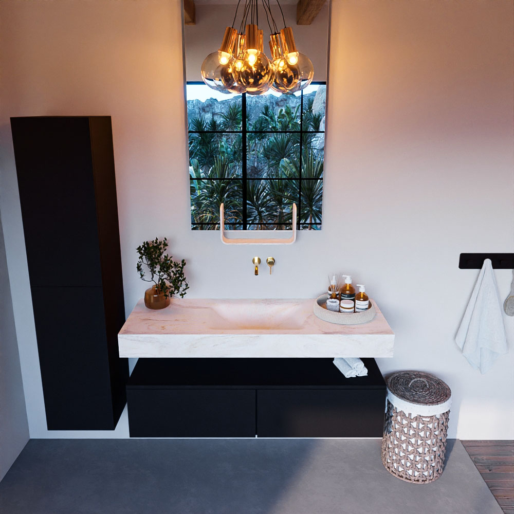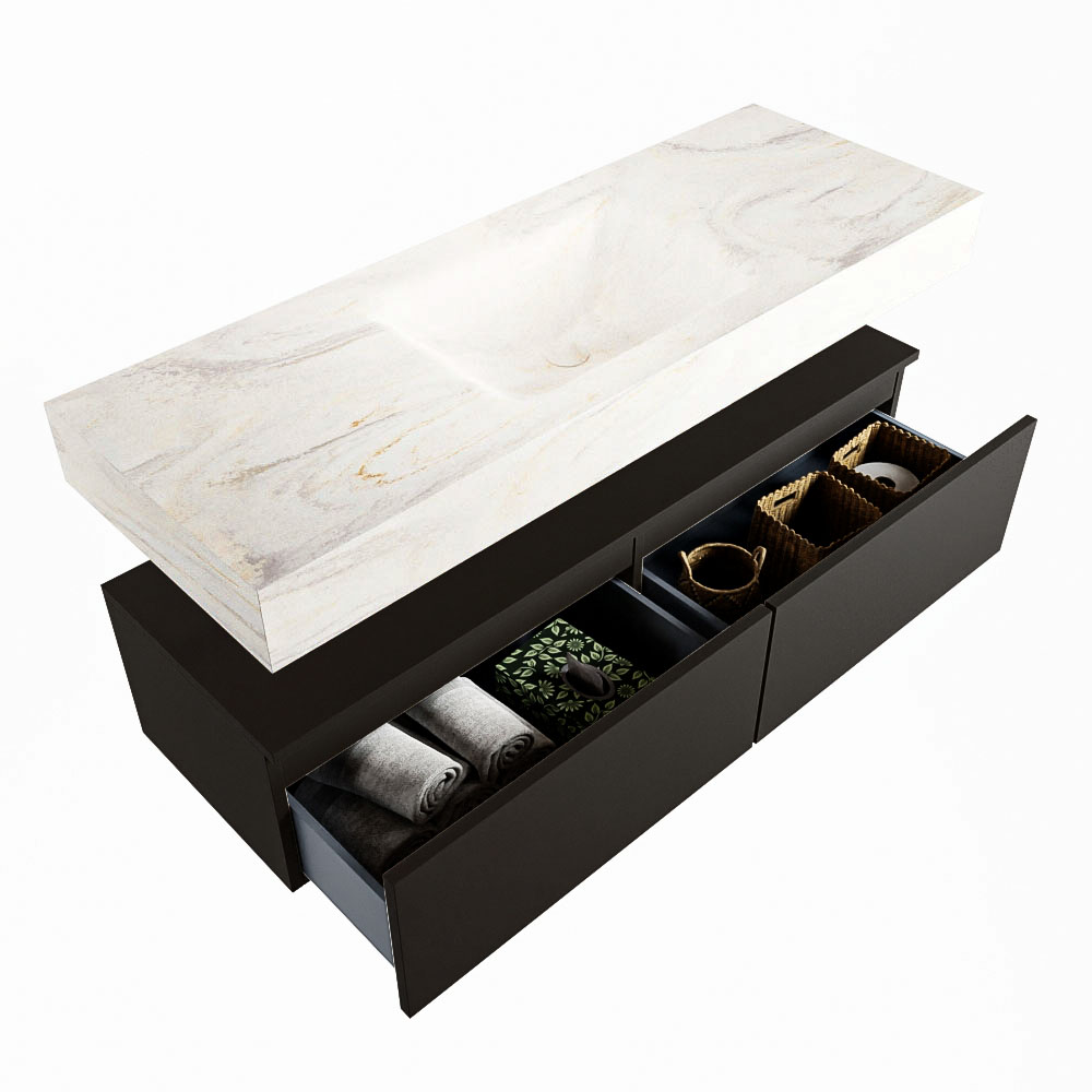 Cree un aspecto elegante y fantástico en su baño con el conjunto de muebles de baño Alan DLUX. El deslumbrante conjunto de muebles de baño ALAN-DLUX consta de un lavabo suspendido con suaves líneas orgánicas de CORIAN en Solid Surface marmolado combinado con el mueble de baño ALAN. El conjunto de muebles de baño ALAN-DLUX es adecuado para cualquier baño, ya sea pequeño o grande. Para completar completamente su baño, también hay disponibles varios accesorios en estos mármoles, como las repisas Mondiaz y los estantes de espejo.
