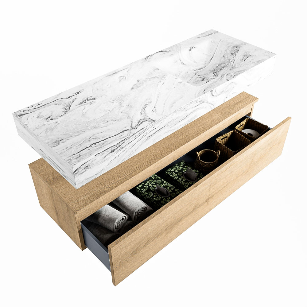 Cree un aspecto elegante y fantástico en su baño con el conjunto de muebles de baño Alan DLUX. El deslumbrante conjunto de muebles de baño ALAN-DLUX consta de un lavabo suspendido con suaves líneas orgánicas de CORIAN en Solid Surface marmolado combinado con el mueble de baño ALAN. El conjunto de muebles de baño ALAN-DLUX es adecuado para cualquier baño, ya sea pequeño o grande. Para completar completamente su baño, también hay disponibles varios accesorios en estos mármoles, como las repisas Mondiaz y los estantes de espejo.