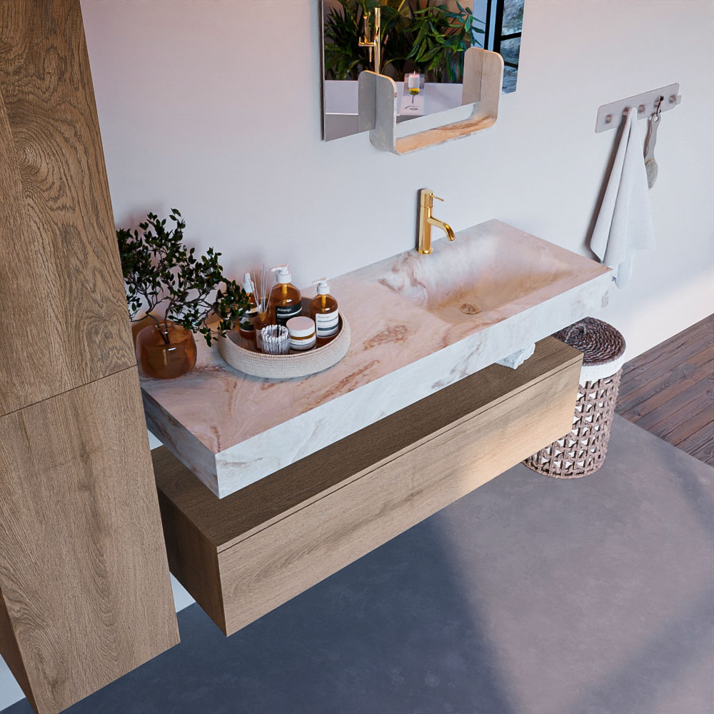 Cree un aspecto elegante y fantástico en su baño con el conjunto de muebles de baño Alan DLUX. El deslumbrante conjunto de muebles de baño ALAN-DLUX consta de un lavabo suspendido con suaves líneas orgánicas de CORIAN en Solid Surface marmolado combinado con el mueble de baño ALAN. El conjunto de muebles de baño ALAN-DLUX es adecuado para cualquier baño, ya sea pequeño o grande. Para completar completamente su baño, también hay disponibles varios accesorios en estos mármoles, como las repisas Mondiaz y los estantes de espejo.