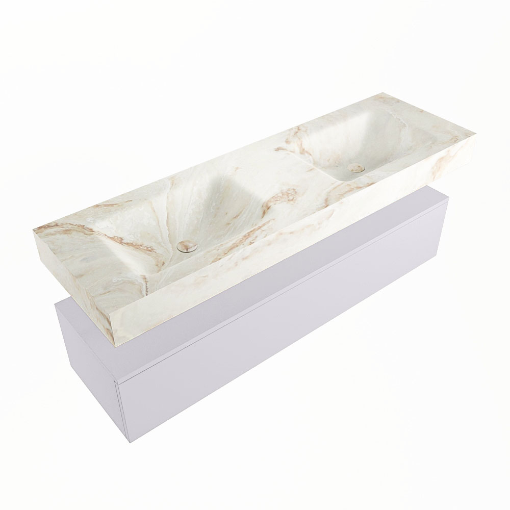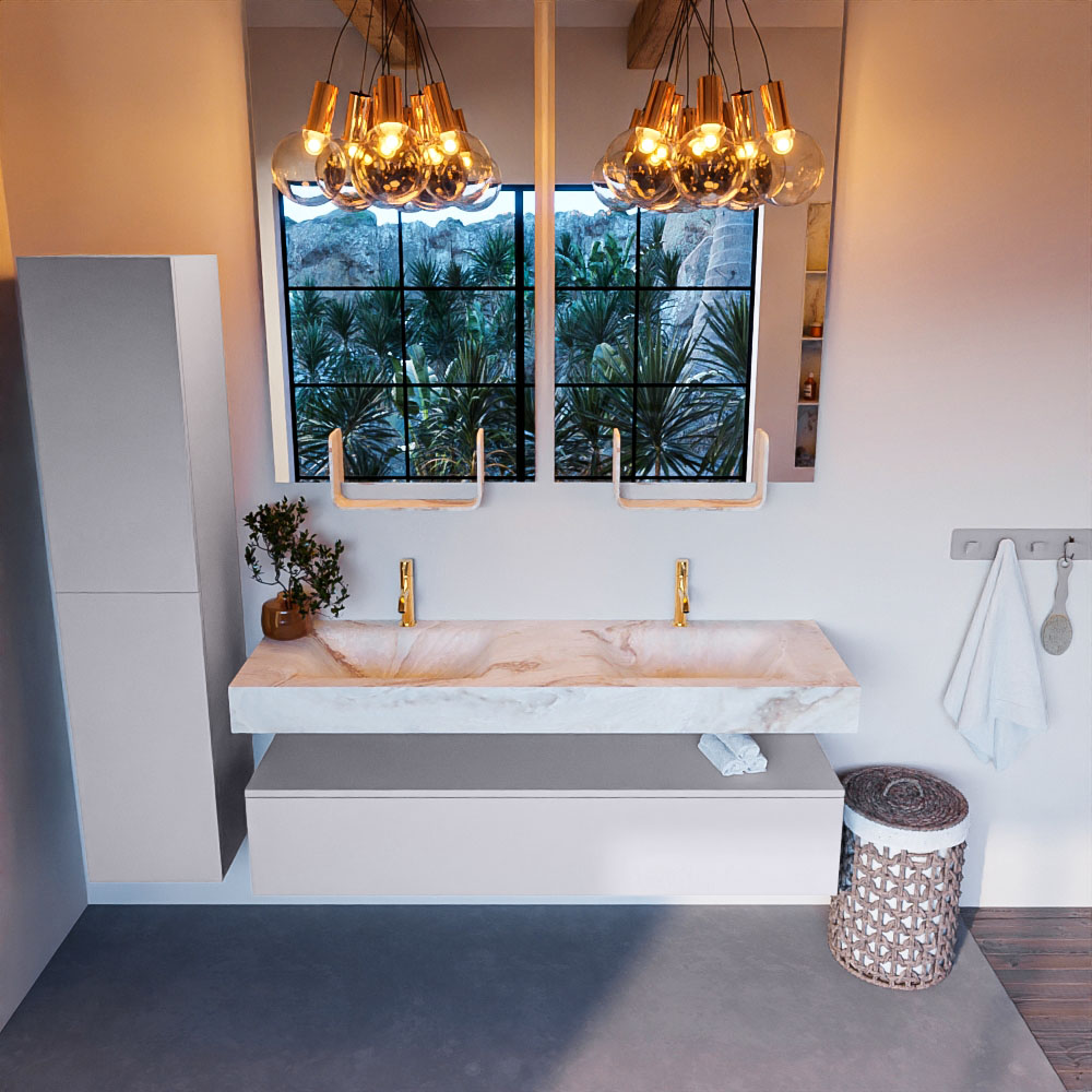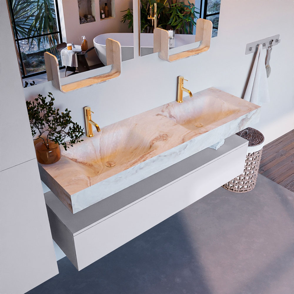Cree un aspecto elegante y fantástico en su baño con el conjunto de muebles de baño Alan DLUX. El deslumbrante conjunto de muebles de baño ALAN-DLUX consta de un lavabo suspendido con suaves líneas orgánicas de CORIAN en Solid Surface marmolado combinado con el mueble de baño ALAN. El conjunto de muebles de baño ALAN-DLUX es adecuado para cualquier baño, ya sea pequeño o grande. Para completar completamente su baño, también hay disponibles varios accesorios en estos mármoles, como las repisas Mondiaz y los estantes de espejo.