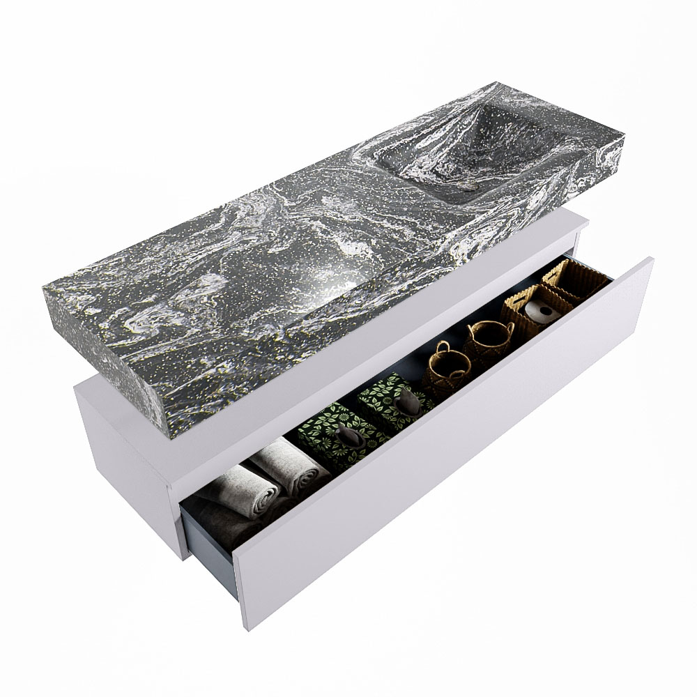 Cree un aspecto elegante y fantástico en su baño con el conjunto de muebles de baño Alan DLUX. El deslumbrante conjunto de muebles de baño ALAN-DLUX consta de un lavabo suspendido con suaves líneas orgánicas de CORIAN en Solid Surface marmolado combinado con el mueble de baño ALAN. El conjunto de muebles de baño ALAN-DLUX es adecuado para cualquier baño, ya sea pequeño o grande. Para completar completamente su baño, también hay disponibles varios accesorios en estos mármoles, como las repisas Mondiaz y los estantes de espejo.