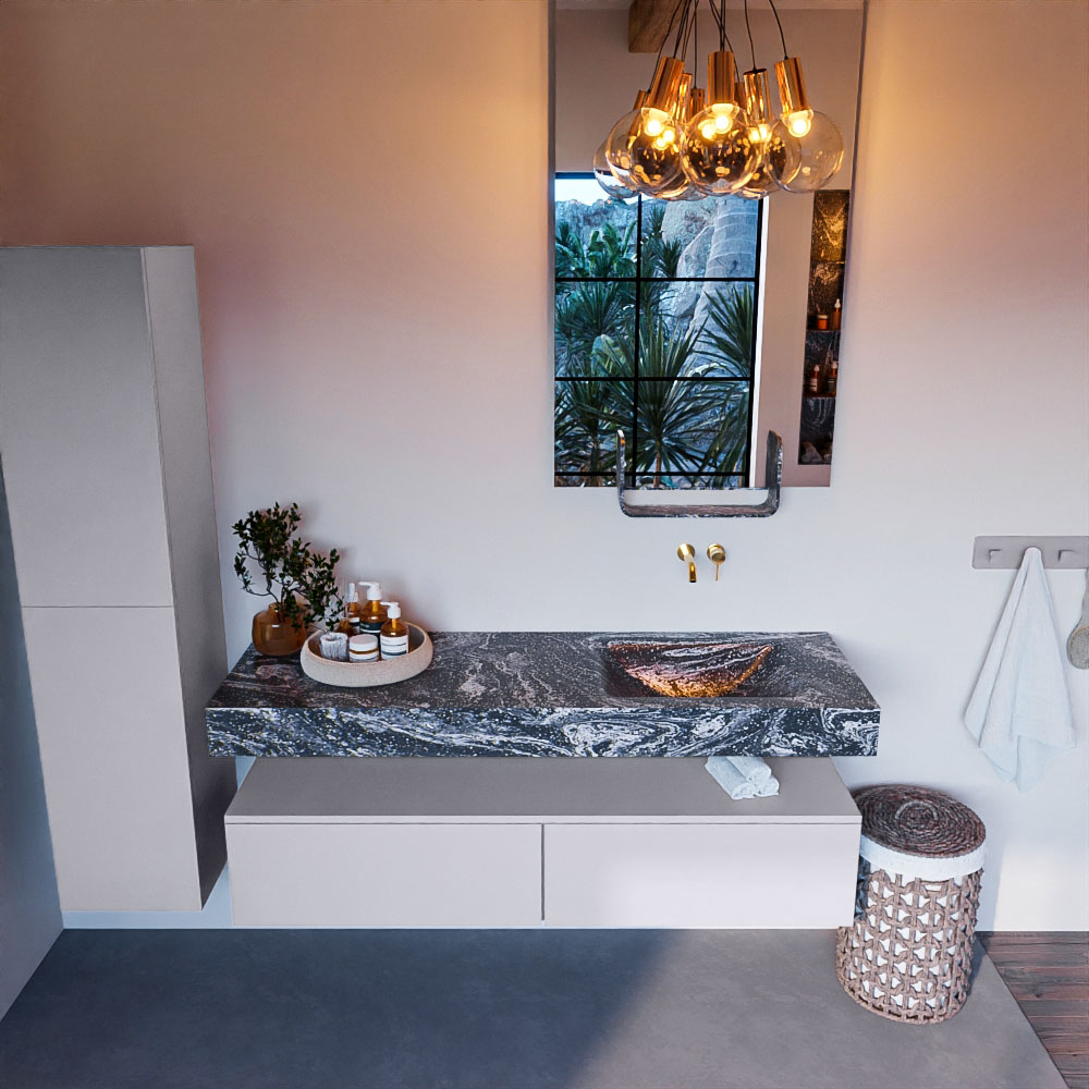 Cree un aspecto elegante y fantástico en su baño con el conjunto de muebles de baño Alan DLUX. El deslumbrante conjunto de muebles de baño ALAN-DLUX consta de un lavabo suspendido con suaves líneas orgánicas de CORIAN en Solid Surface marmolado combinado con el mueble de baño ALAN. El conjunto de muebles de baño ALAN-DLUX es adecuado para cualquier baño, ya sea pequeño o grande. Para completar completamente su baño, también hay disponibles varios accesorios en estos mármoles, como las repisas Mondiaz y los estantes de espejo.