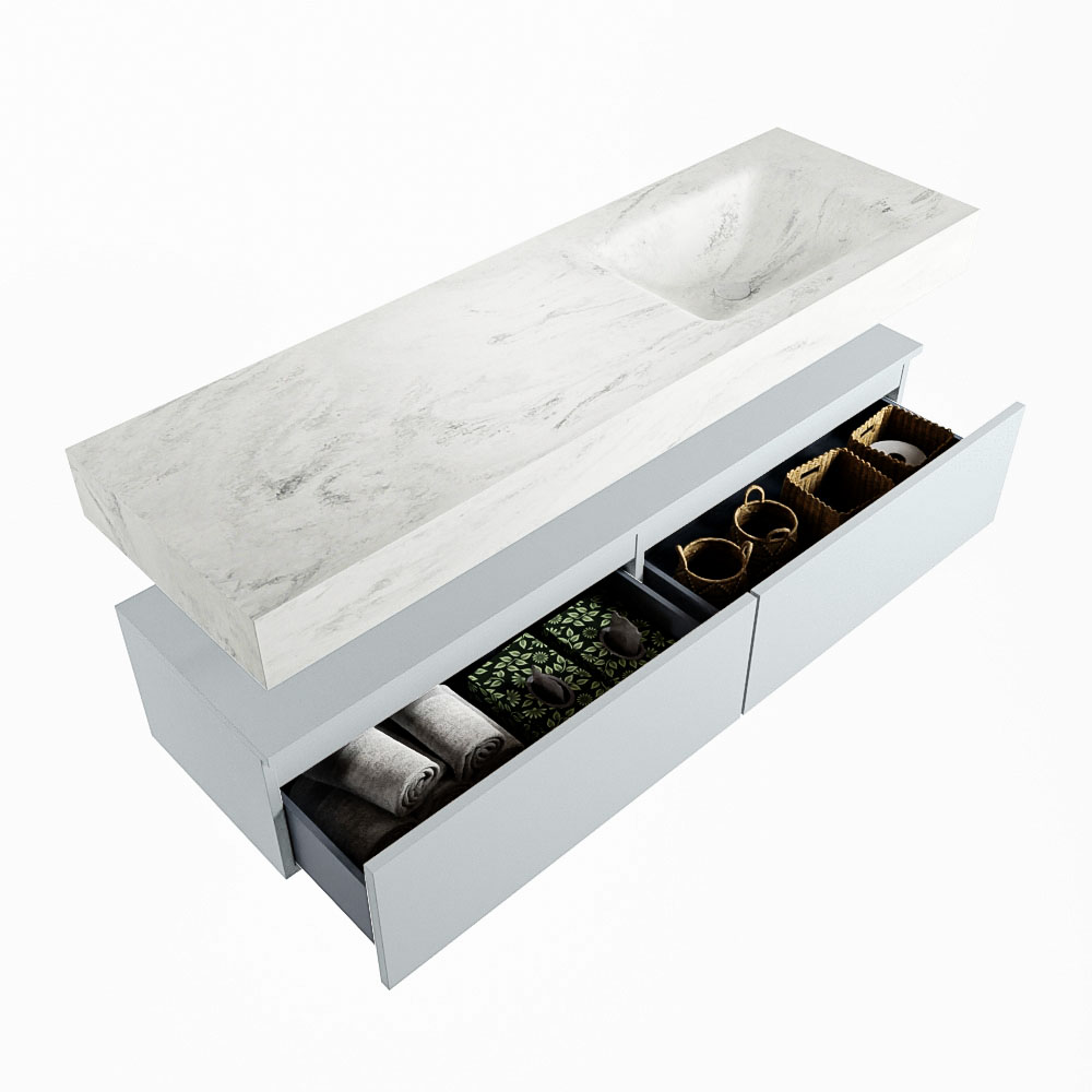 Cree un aspecto elegante y fantástico en su baño con el conjunto de muebles de baño Alan DLUX. El deslumbrante conjunto de muebles de baño ALAN-DLUX consta de un lavabo suspendido con suaves líneas orgánicas de CORIAN en Solid Surface marmolado combinado con el mueble de baño ALAN. El conjunto de muebles de baño ALAN-DLUX es adecuado para cualquier baño, ya sea pequeño o grande. Para completar completamente su baño, también hay disponibles varios accesorios en estos mármoles, como las repisas Mondiaz y los estantes de espejo.