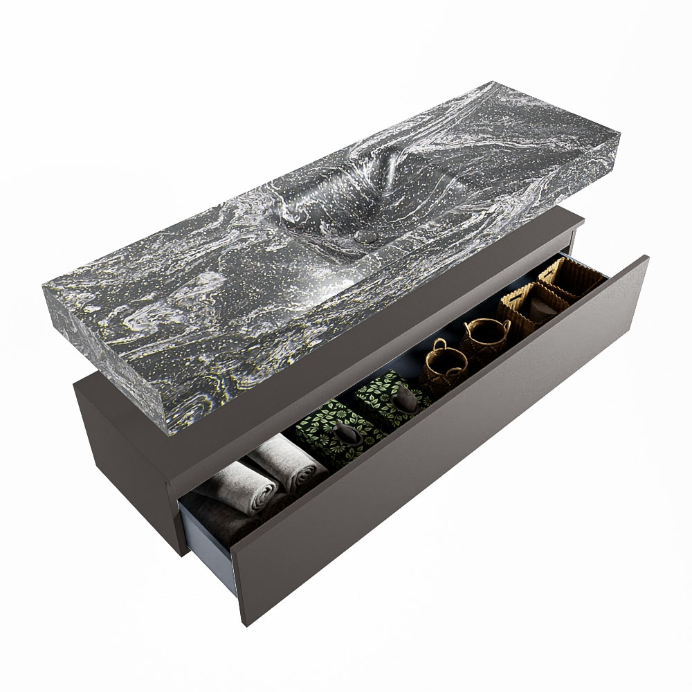 Cree un aspecto elegante y fantástico en su baño con el conjunto de muebles de baño Alan DLUX. El deslumbrante conjunto de muebles de baño ALAN-DLUX consta de un lavabo suspendido con suaves líneas orgánicas de CORIAN en Solid Surface marmolado combinado con el mueble de baño ALAN. El conjunto de muebles de baño ALAN-DLUX es adecuado para cualquier baño, ya sea pequeño o grande. Para completar completamente su baño, también hay disponibles varios accesorios en estos mármoles, como las repisas Mondiaz y los estantes de espejo.