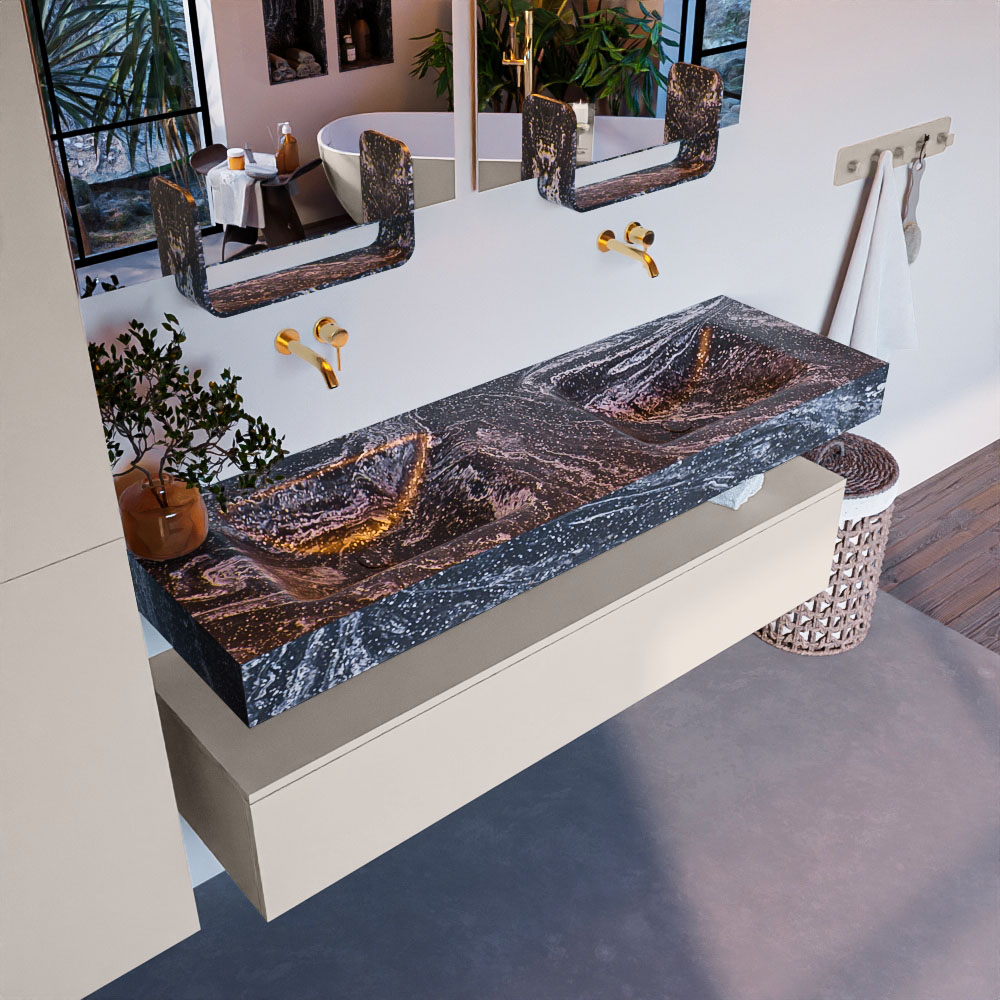 Cree un aspecto elegante y fantástico en su baño con el conjunto de muebles de baño Alan DLUX. El deslumbrante conjunto de muebles de baño ALAN-DLUX consta de un lavabo suspendido con suaves líneas orgánicas de CORIAN en Solid Surface marmolado combinado con el mueble de baño ALAN. El conjunto de muebles de baño ALAN-DLUX es adecuado para cualquier baño, ya sea pequeño o grande. Para completar completamente su baño, también hay disponibles varios accesorios en estos mármoles, como las repisas Mondiaz y los estantes de espejo.