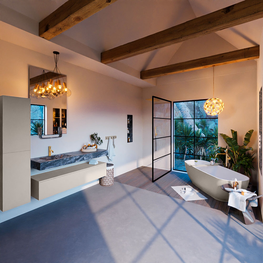 Cree un aspecto elegante y fantástico en su baño con el conjunto de muebles de baño Alan DLUX. El deslumbrante conjunto de muebles de baño ALAN-DLUX consta de un lavabo suspendido con suaves líneas orgánicas de CORIAN en Solid Surface marmolado combinado con el mueble de baño ALAN. El conjunto de muebles de baño ALAN-DLUX es adecuado para cualquier baño, ya sea pequeño o grande. Para completar completamente su baño, también hay disponibles varios accesorios en estos mármoles, como las repisas Mondiaz y los estantes de espejo.