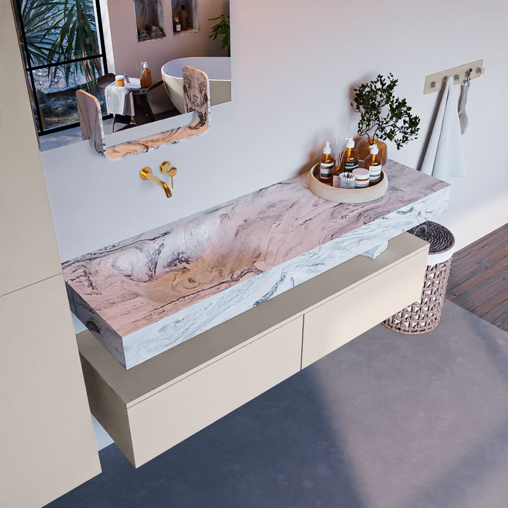 Cree un aspecto elegante y fantástico en su baño con el conjunto de muebles de baño Alan DLUX. El deslumbrante conjunto de muebles de baño ALAN-DLUX consta de un lavabo suspendido con suaves líneas orgánicas de CORIAN en Solid Surface marmolado combinado con el mueble de baño ALAN. El conjunto de muebles de baño ALAN-DLUX es adecuado para cualquier baño, ya sea pequeño o grande. Para completar completamente su baño, también hay disponibles varios accesorios en estos mármoles, como las repisas Mondiaz y los estantes de espejo.