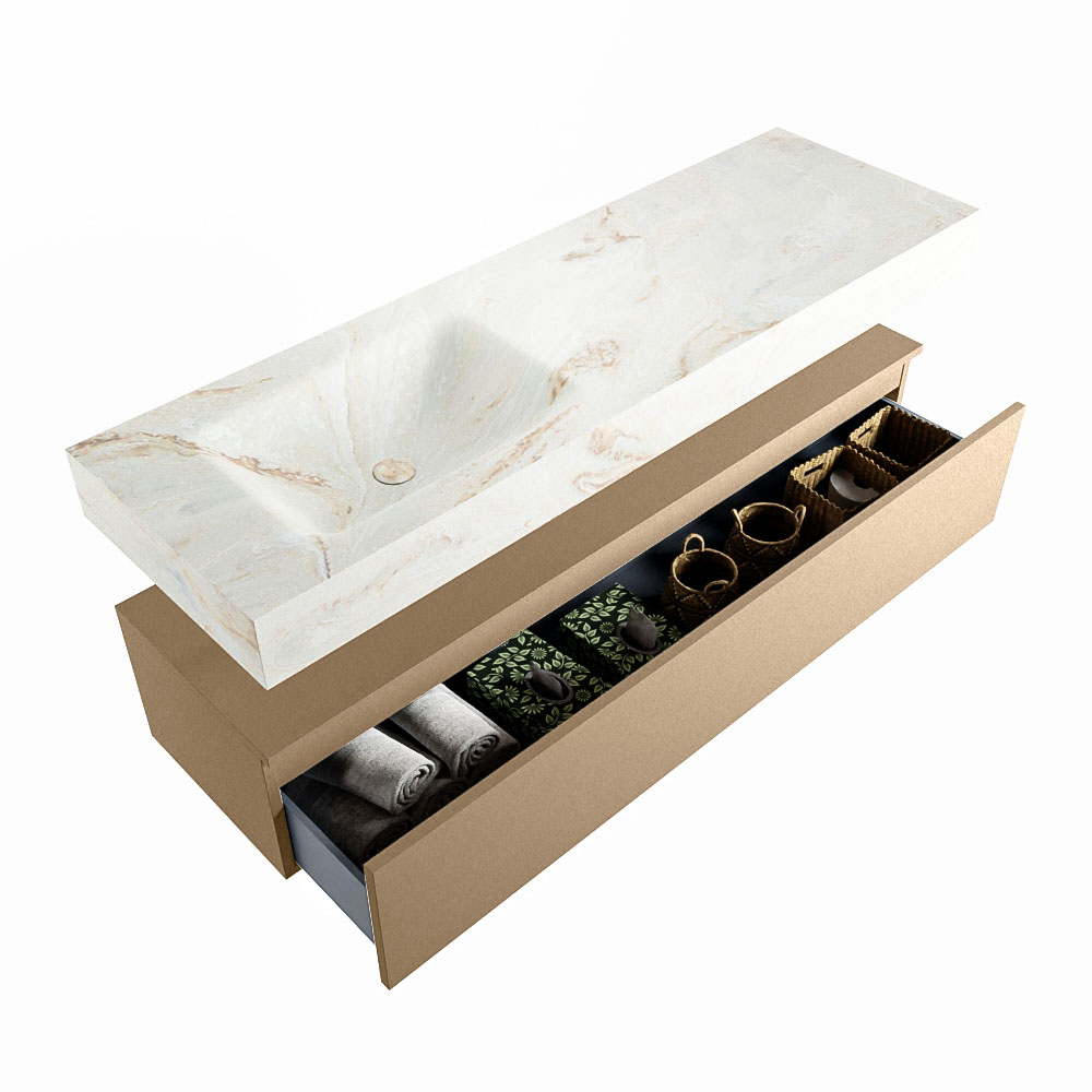 Cree un aspecto elegante y fantástico en su baño con el conjunto de muebles de baño Alan DLUX. El deslumbrante conjunto de muebles de baño ALAN-DLUX consta de un lavabo suspendido con suaves líneas orgánicas de CORIAN en Solid Surface marmolado combinado con el mueble de baño ALAN. El conjunto de muebles de baño ALAN-DLUX es adecuado para cualquier baño, ya sea pequeño o grande. Para completar completamente su baño, también hay disponibles varios accesorios en estos mármoles, como las repisas Mondiaz y los estantes de espejo.