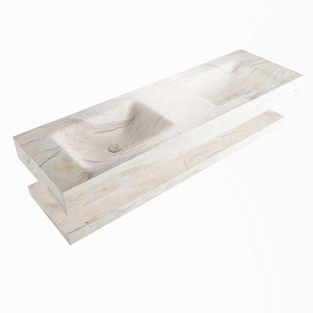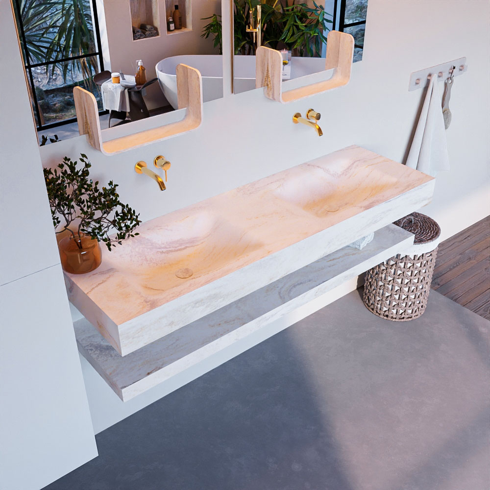 Crea una apariencia elegante y fantástica en tu baño con el conjunto de muebles de baño Alan DLUX. El brillante conjunto de muebles de baño ALAN-DLUX consta de un lavabo suspendido con suaves líneas orgánicas de CORIAN en una superficie sólida marmolada, combinado con un estante. El conjunto de muebles de baño ALAN-DLUX es adecuado para cualquier baño, ya sea pequeño o grande. Para completar completamente tu baño, también hay disponibles varios accesorios en estos mármoles, como los nichos Mondiaz y los estantes con espejo.