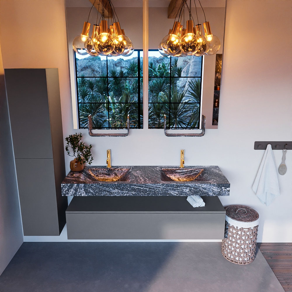 Cree un aspecto elegante y fantástico en su baño con el conjunto de muebles de baño Alan DLUX. El deslumbrante conjunto de muebles de baño ALAN-DLUX consta de un lavabo suspendido con suaves líneas orgánicas de CORIAN en Solid Surface marmolado combinado con el mueble de baño ALAN. El conjunto de muebles de baño ALAN-DLUX es adecuado para cualquier baño, ya sea pequeño o grande. Para completar completamente su baño, también hay disponibles varios accesorios en estos mármoles, como las repisas Mondiaz y los estantes de espejo.