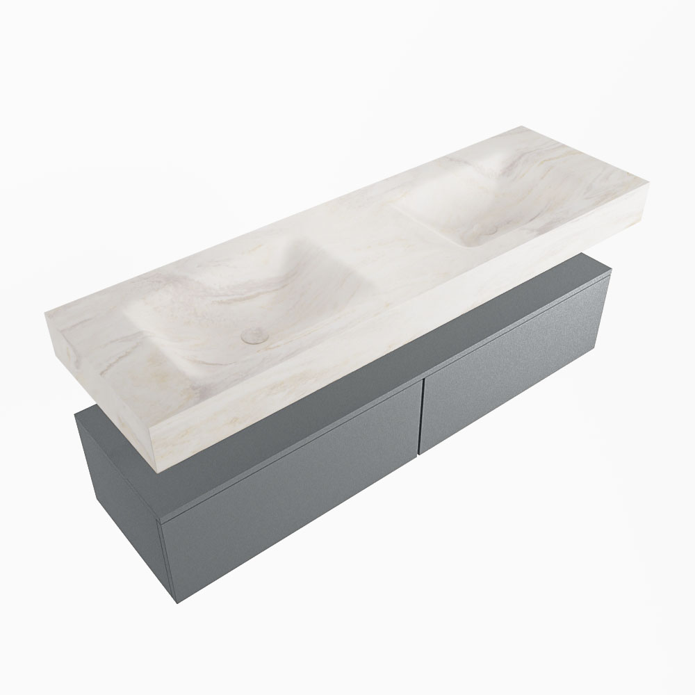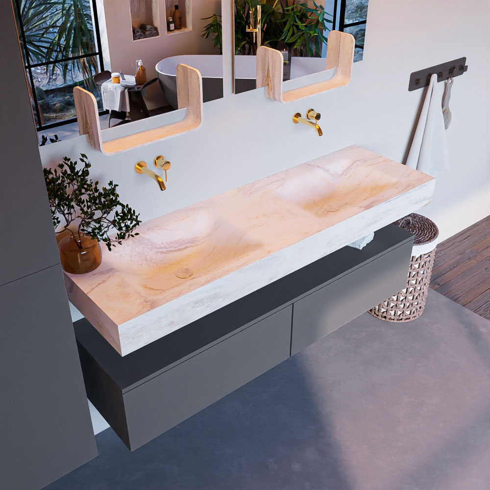Cree un aspecto elegante y fantástico en su baño con el conjunto de muebles de baño Alan DLUX. El deslumbrante conjunto de muebles de baño ALAN-DLUX consta de un lavabo suspendido con suaves líneas orgánicas de CORIAN en Solid Surface marmolado combinado con el mueble de baño ALAN. El conjunto de muebles de baño ALAN-DLUX es adecuado para cualquier baño, ya sea pequeño o grande. Para completar completamente su baño, también hay disponibles varios accesorios en estos mármoles, como las repisas Mondiaz y los estantes de espejo.
