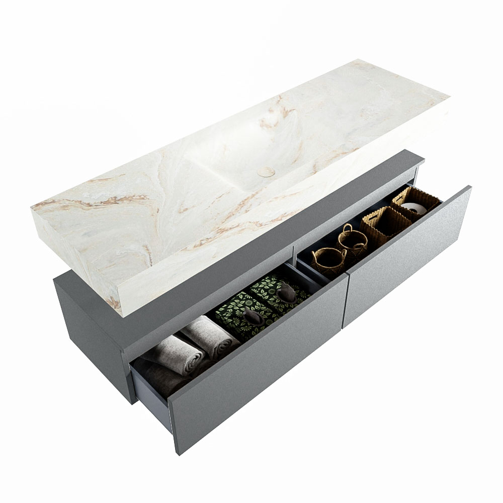 Cree un aspecto elegante y fantástico en su baño con el conjunto de muebles de baño Alan DLUX. El deslumbrante conjunto de muebles de baño ALAN-DLUX consta de un lavabo suspendido con suaves líneas orgánicas de CORIAN en Solid Surface marmolado combinado con el mueble de baño ALAN. El conjunto de muebles de baño ALAN-DLUX es adecuado para cualquier baño, ya sea pequeño o grande. Para completar completamente su baño, también hay disponibles varios accesorios en estos mármoles, como las repisas Mondiaz y los estantes de espejo.