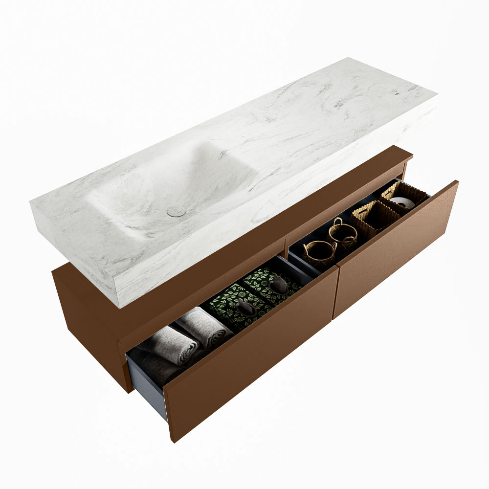 Cree un aspecto elegante y fantástico en su baño con el conjunto de muebles de baño Alan DLUX. El deslumbrante conjunto de muebles de baño ALAN-DLUX consta de un lavabo suspendido con suaves líneas orgánicas de CORIAN en Solid Surface marmolado combinado con el mueble de baño ALAN. El conjunto de muebles de baño ALAN-DLUX es adecuado para cualquier baño, ya sea pequeño o grande. Para completar completamente su baño, también hay disponibles varios accesorios en estos mármoles, como las repisas Mondiaz y los estantes de espejo.