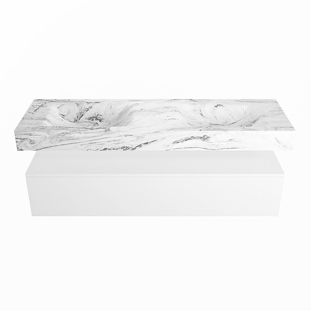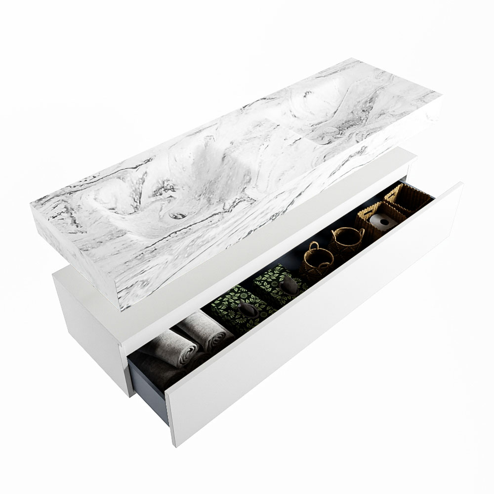 Cree un aspecto elegante y fantástico en su baño con el conjunto de muebles de baño Alan DLUX. El deslumbrante conjunto de muebles de baño ALAN-DLUX consta de un lavabo suspendido con suaves líneas orgánicas de CORIAN en Solid Surface marmolado combinado con el mueble de baño ALAN. El conjunto de muebles de baño ALAN-DLUX es adecuado para cualquier baño, ya sea pequeño o grande. Para completar completamente su baño, también hay disponibles varios accesorios en estos mármoles, como las repisas Mondiaz y los estantes de espejo.
