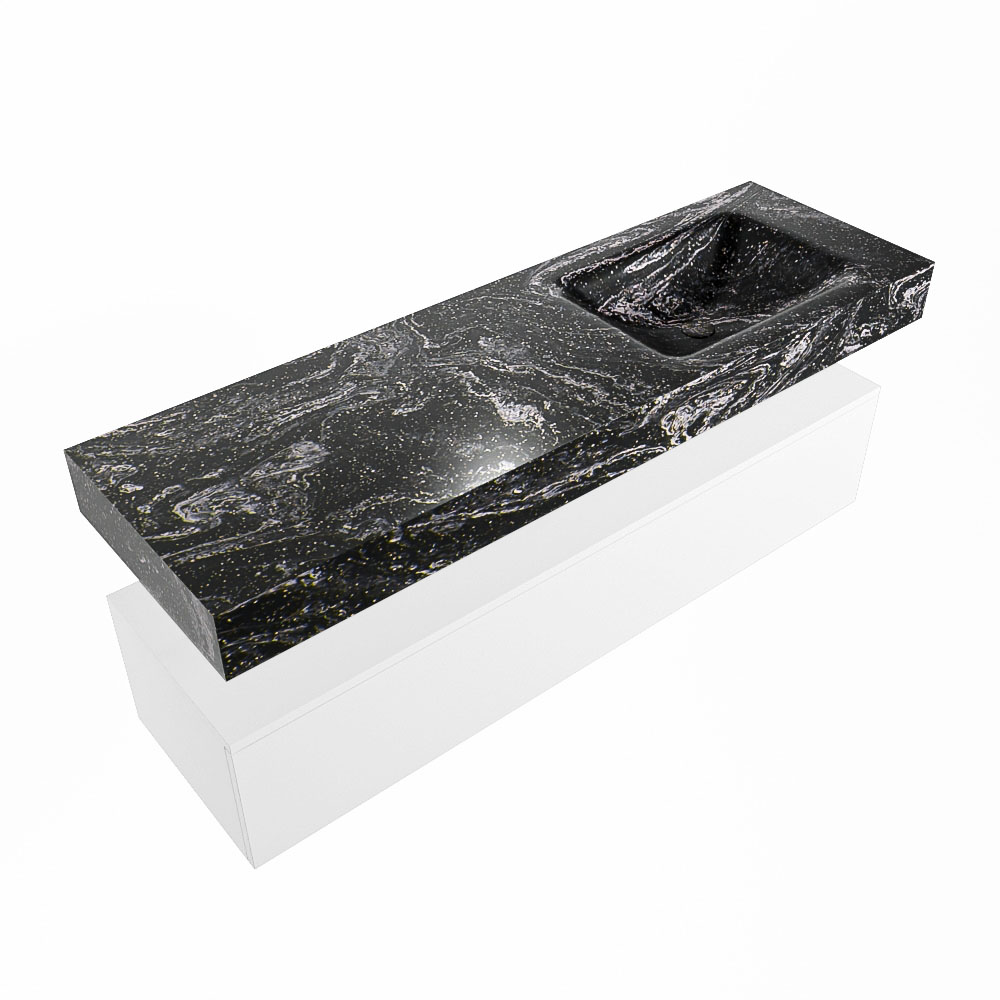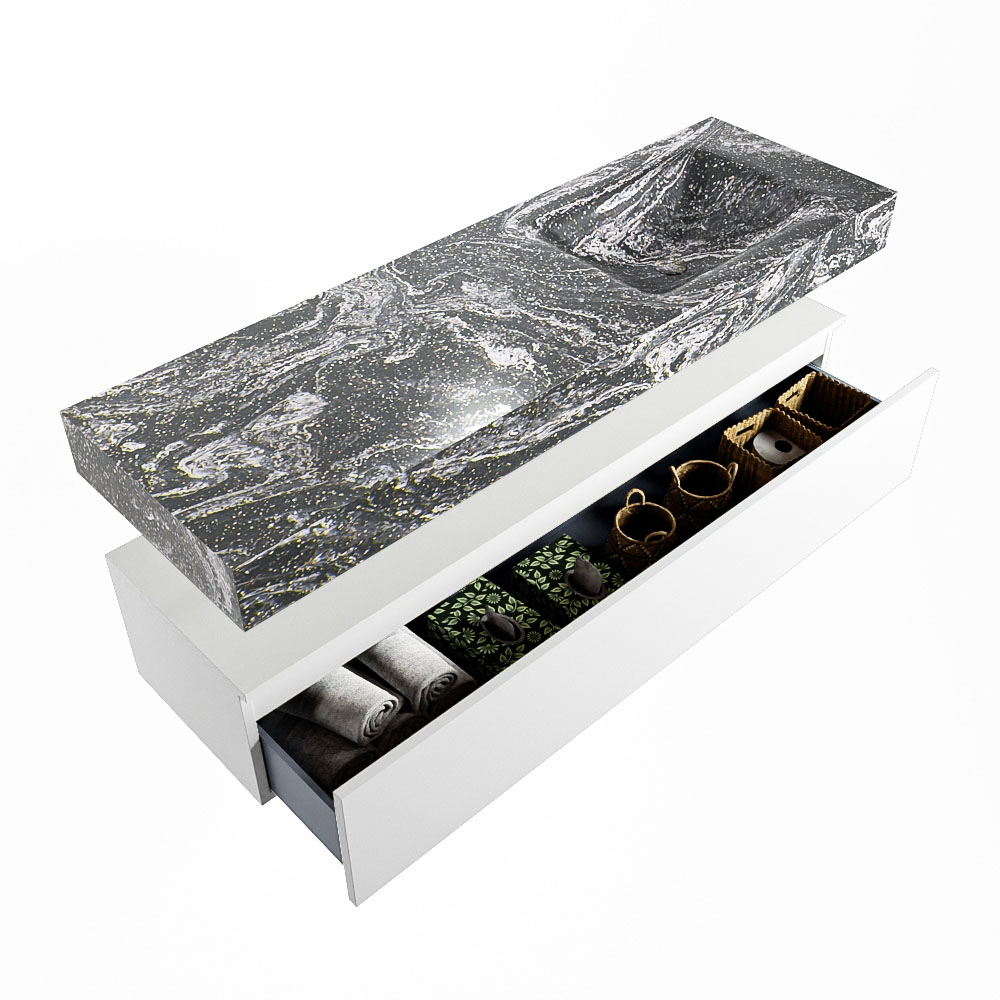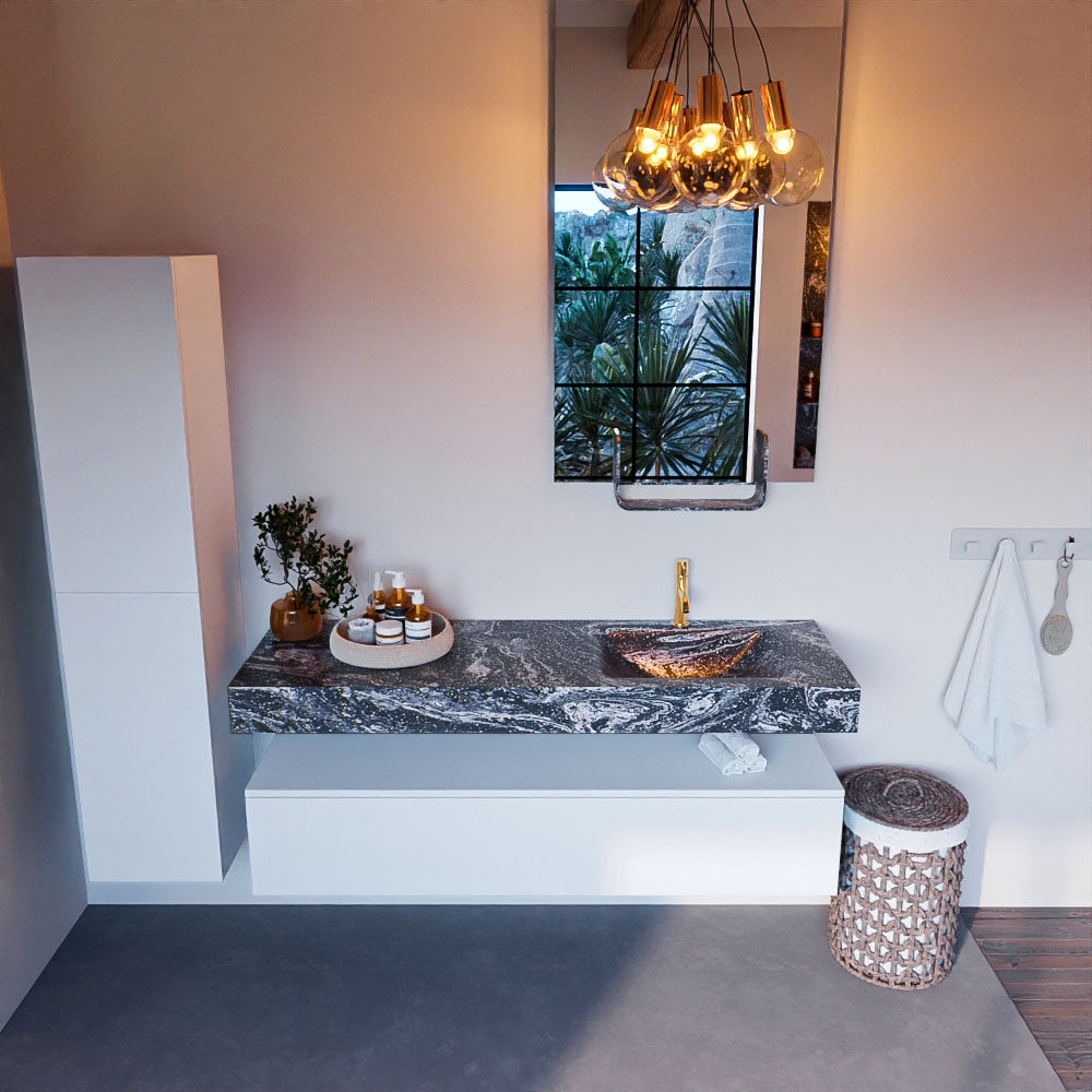 Cree un aspecto elegante y fantástico en su baño con el conjunto de muebles de baño Alan DLUX. El deslumbrante conjunto de muebles de baño ALAN-DLUX consta de un lavabo suspendido con suaves líneas orgánicas de CORIAN en Solid Surface marmolado combinado con el mueble de baño ALAN. El conjunto de muebles de baño ALAN-DLUX es adecuado para cualquier baño, ya sea pequeño o grande. Para completar completamente su baño, también hay disponibles varios accesorios en estos mármoles, como las repisas Mondiaz y los estantes de espejo.
