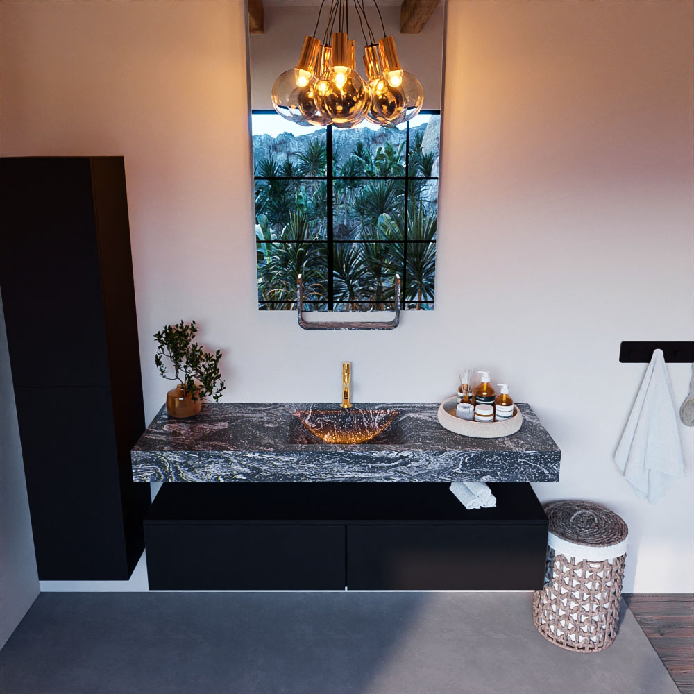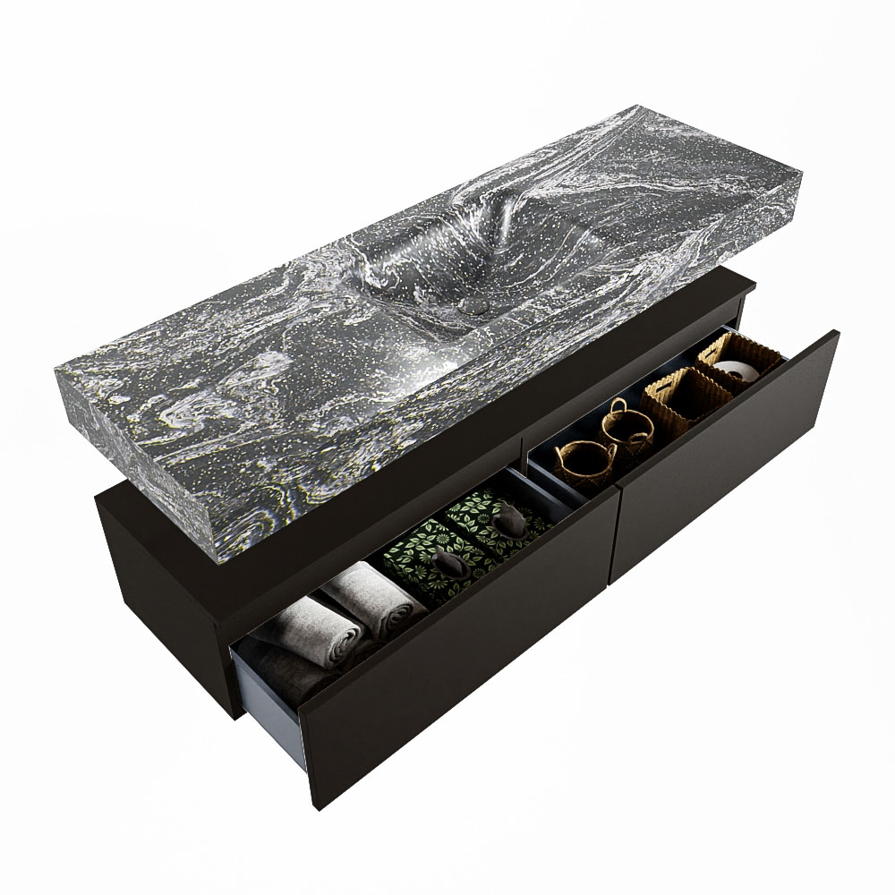 Cree un aspecto elegante y fantástico en su baño con el conjunto de muebles de baño Alan DLUX. El deslumbrante conjunto de muebles de baño ALAN-DLUX consta de un lavabo suspendido con suaves líneas orgánicas de CORIAN en Solid Surface marmolado combinado con el mueble de baño ALAN. El conjunto de muebles de baño ALAN-DLUX es adecuado para cualquier baño, ya sea pequeño o grande. Para completar completamente su baño, también hay disponibles varios accesorios en estos mármoles, como las repisas Mondiaz y los estantes de espejo.