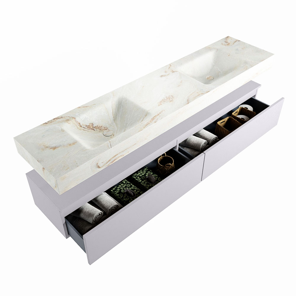 Cree un aspecto elegante y fantástico en su baño con el conjunto de muebles de baño Alan DLUX. El deslumbrante conjunto de muebles de baño ALAN-DLUX consta de un lavabo suspendido con suaves líneas orgánicas de CORIAN en Solid Surface marmolado combinado con el mueble de baño ALAN. El conjunto de muebles de baño ALAN-DLUX es adecuado para cualquier baño, ya sea pequeño o grande. Para completar completamente su baño, también hay disponibles varios accesorios en estos mármoles, como las repisas Mondiaz y los estantes de espejo.