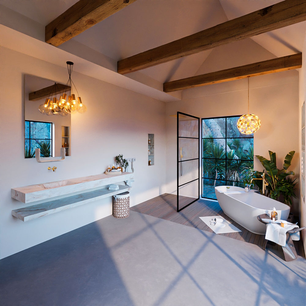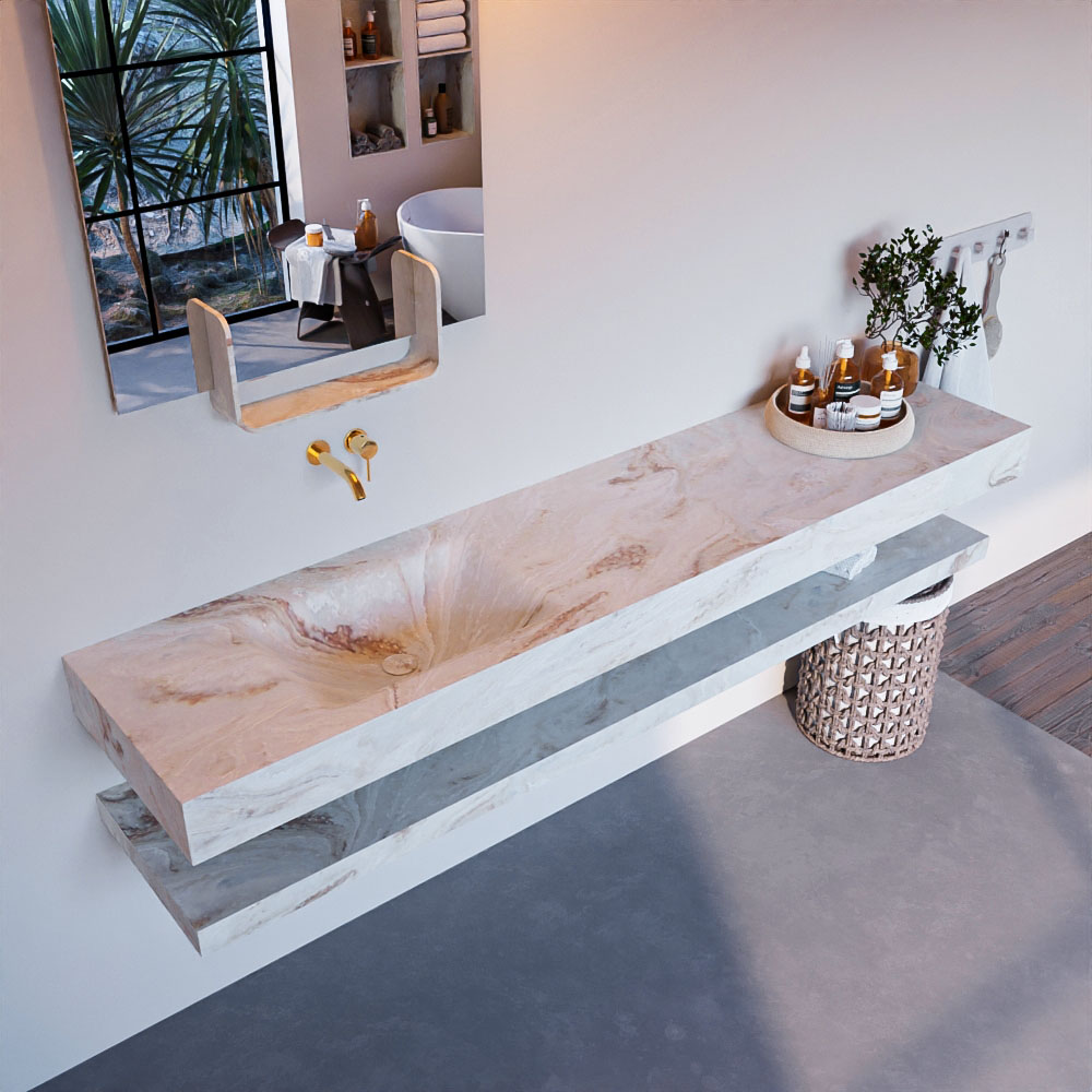 Crea una apariencia elegante y fantástica en tu baño con el conjunto de muebles de baño Alan DLUX. El brillante conjunto de muebles de baño ALAN-DLUX consta de un lavabo suspendido con suaves líneas orgánicas de CORIAN en una superficie sólida marmolada, combinado con un estante. El conjunto de muebles de baño ALAN-DLUX es adecuado para cualquier baño, ya sea pequeño o grande. Para completar completamente tu baño, también hay disponibles varios accesorios en estos mármoles, como los nichos Mondiaz y los estantes con espejo.