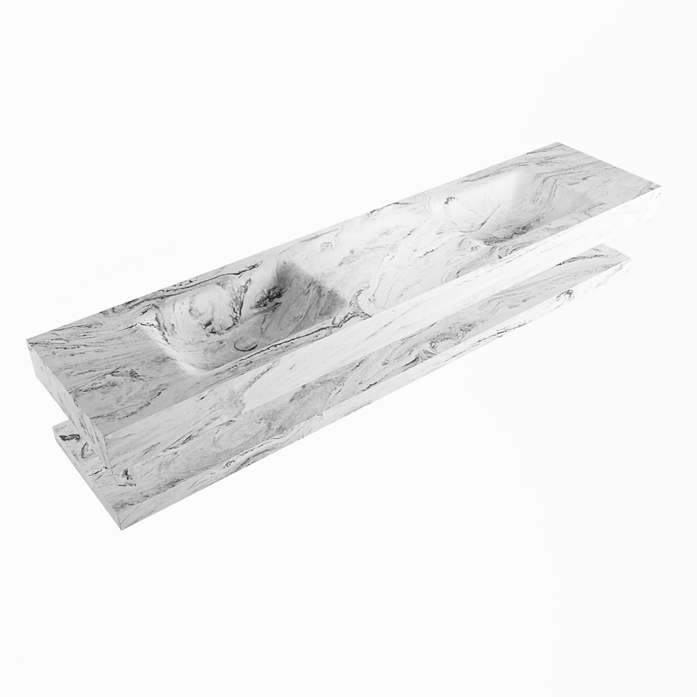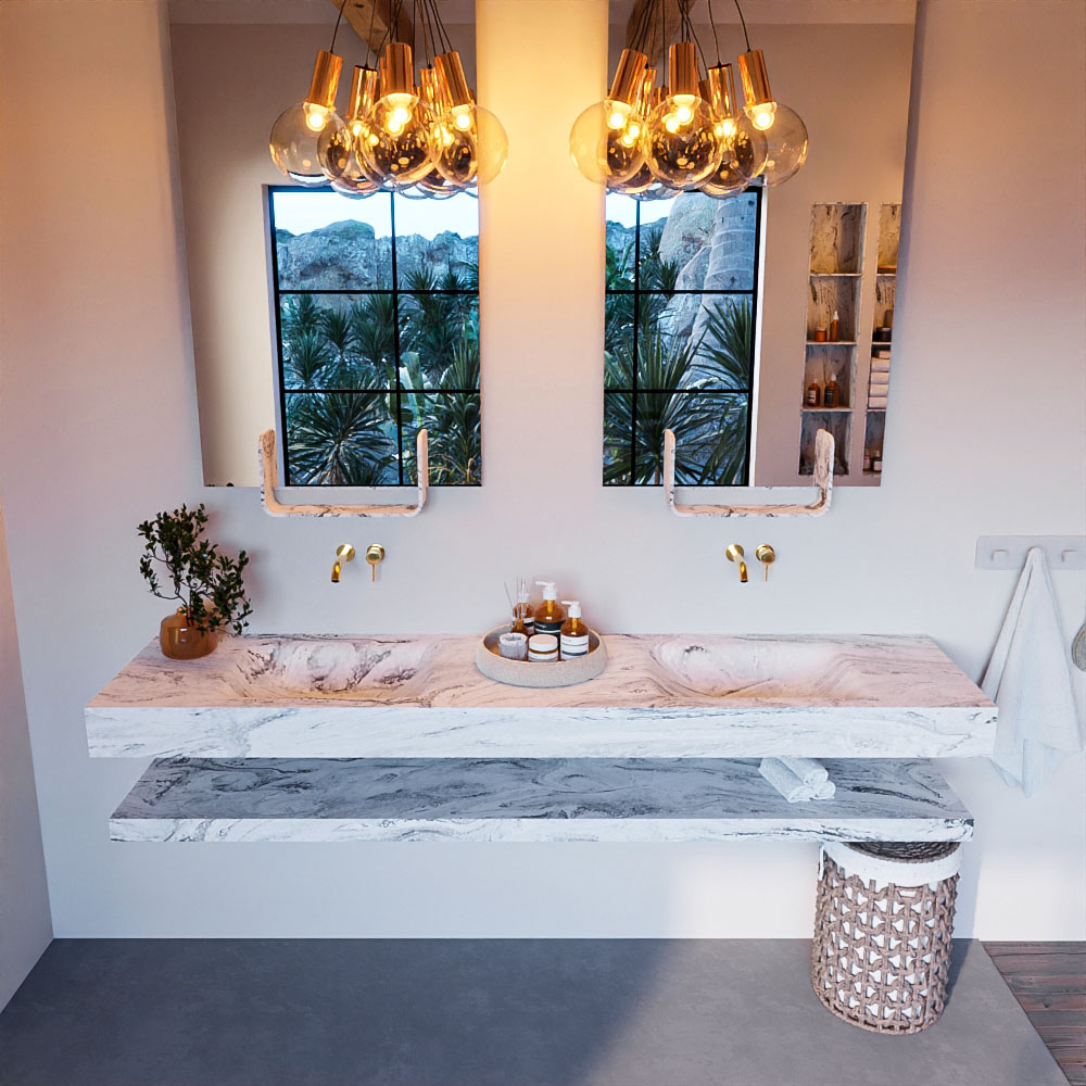 Crea una apariencia elegante y fantástica en tu baño con el conjunto de muebles de baño Alan DLUX. El brillante conjunto de muebles de baño ALAN-DLUX consta de un lavabo suspendido con suaves líneas orgánicas de CORIAN en una superficie sólida marmolada, combinado con un estante. El conjunto de muebles de baño ALAN-DLUX es adecuado para cualquier baño, ya sea pequeño o grande. Para completar completamente tu baño, también hay disponibles varios accesorios en estos mármoles, como los nichos Mondiaz y los estantes con espejo.