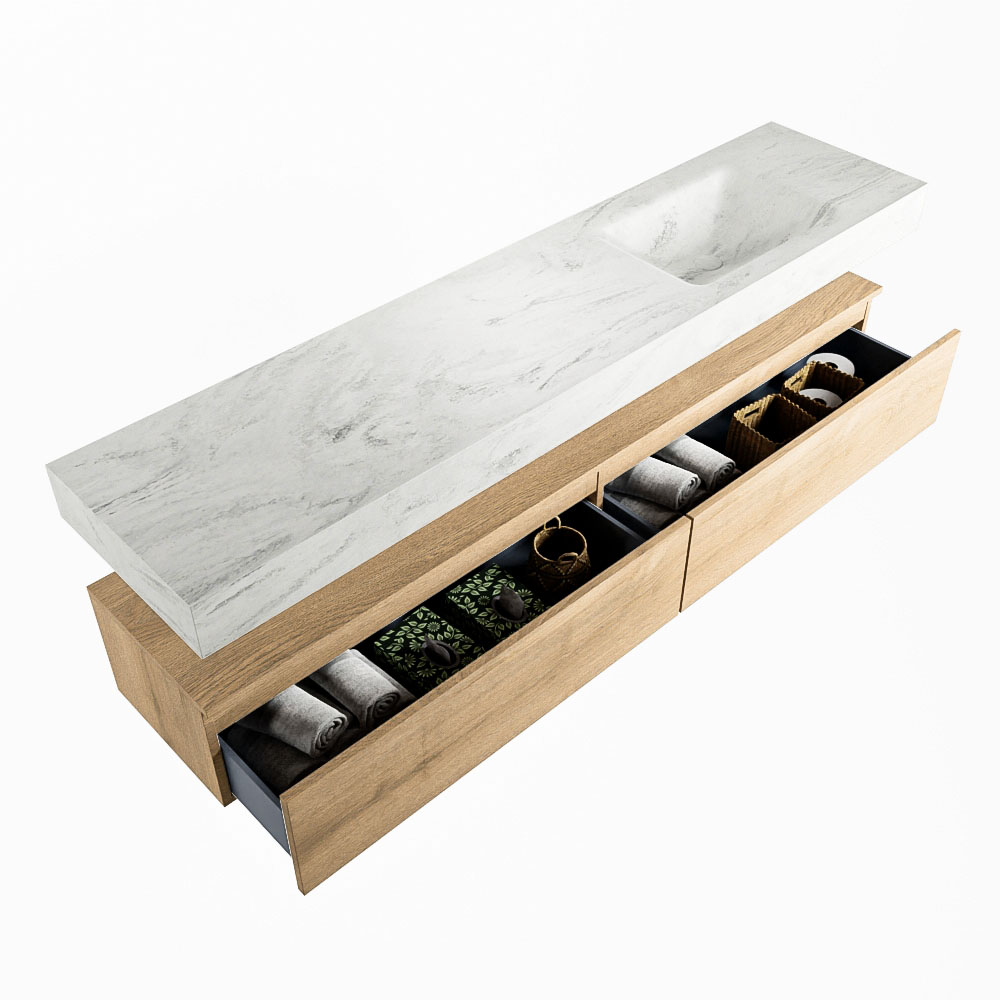 MONDIAZ ALAN-DLUX 200cm mueble de baño Washed Oak 2 cajones. Lavabo CLOUD Derecho sin orificios color Opalo.