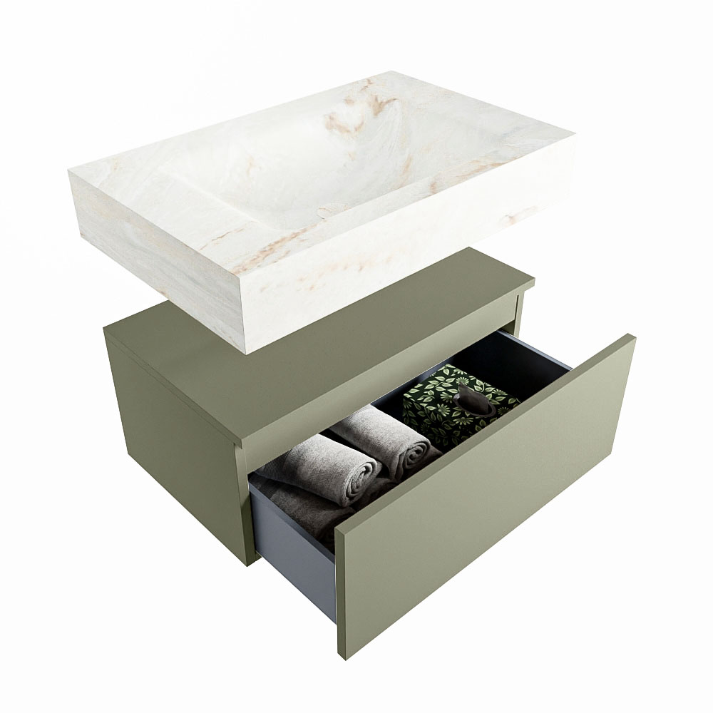 Cree un aspecto elegante y fantástico en su baño con el conjunto de muebles de baño Alan DLUX. El deslumbrante conjunto de muebles de baño ALAN-DLUX consta de un lavabo suspendido con suaves líneas orgánicas de CORIAN en Solid Surface marmolado combinado con el mueble de baño ALAN. El conjunto de muebles de baño ALAN-DLUX es adecuado para cualquier baño, ya sea pequeño o grande. Para completar completamente su baño, también hay disponibles varios accesorios en estos mármoles, como las repisas Mondiaz y los estantes de espejo.