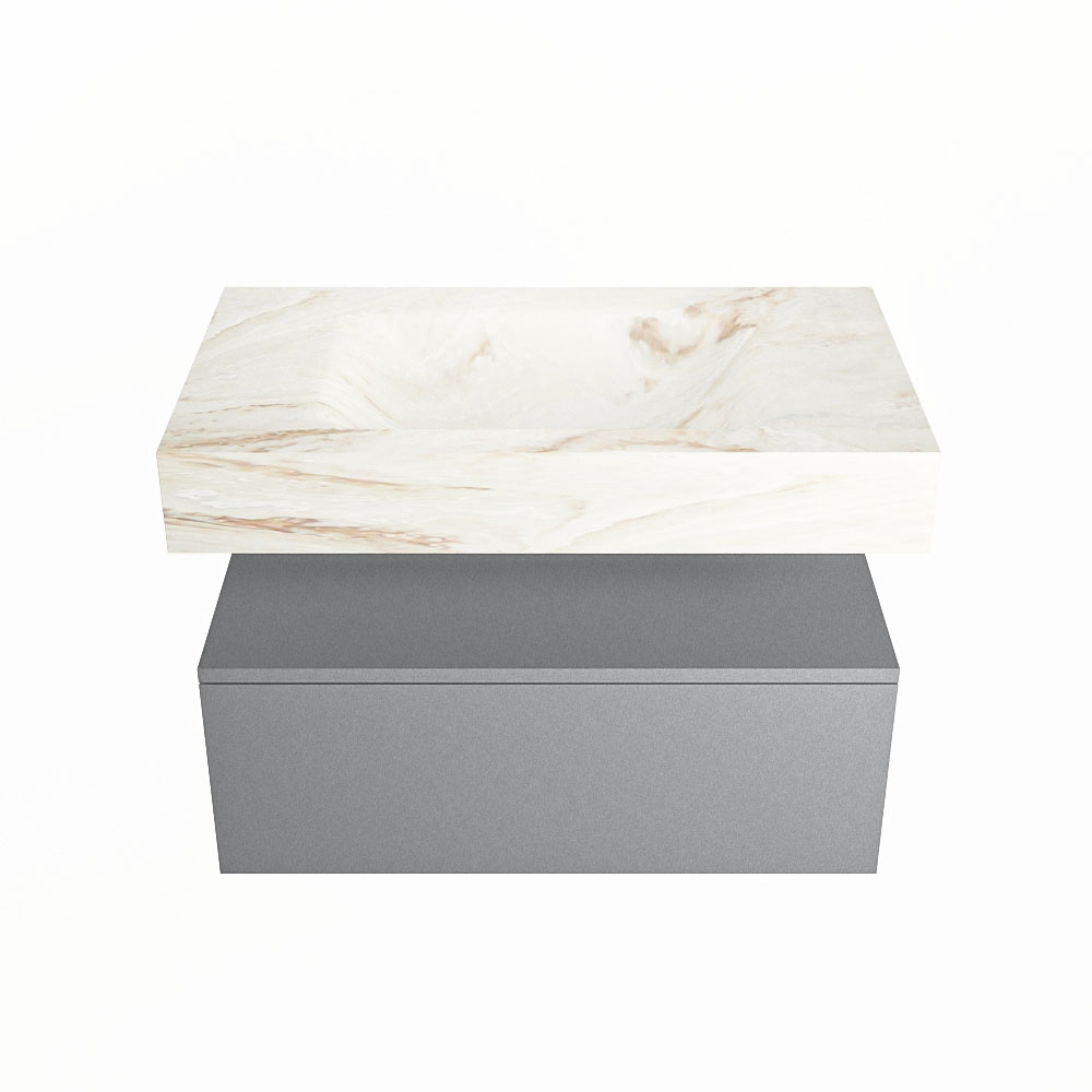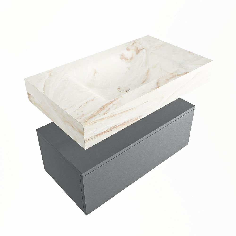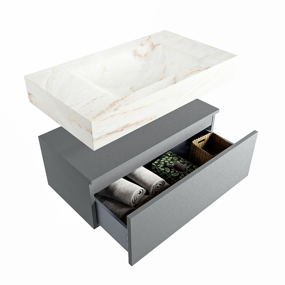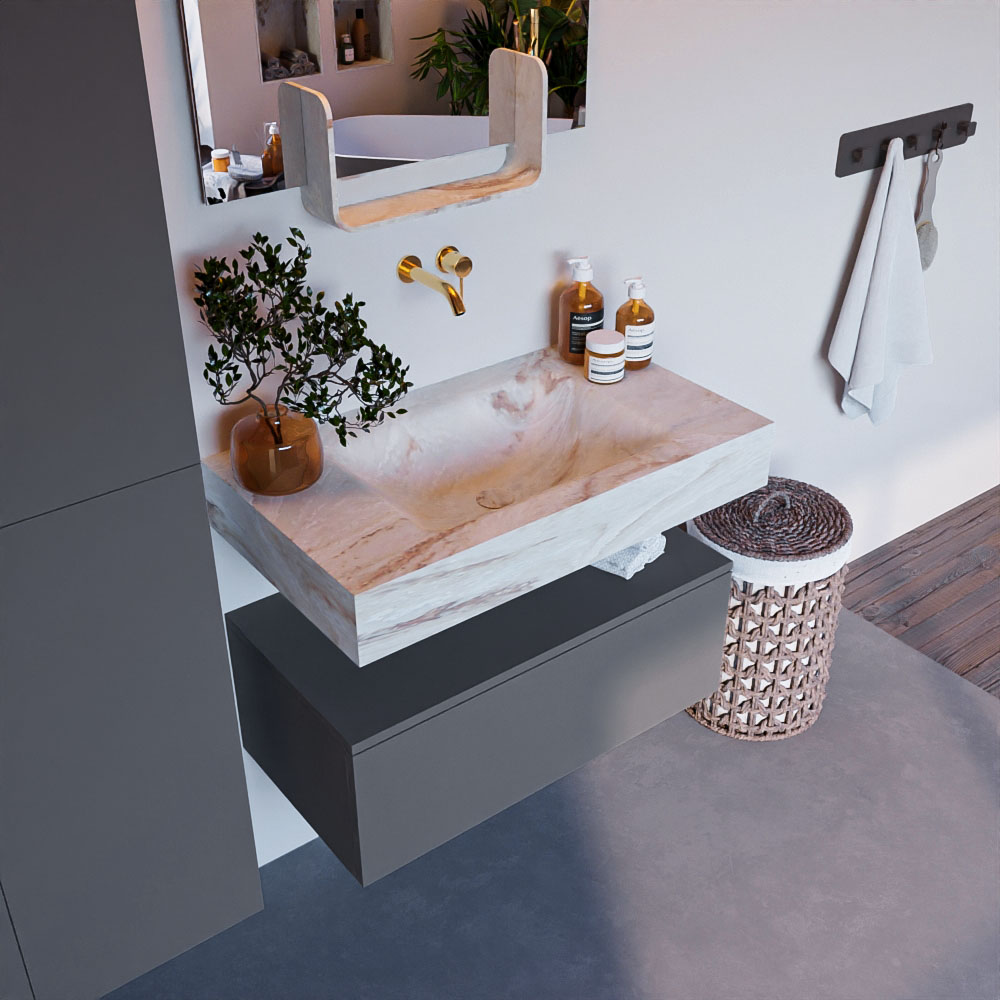 Cree un aspecto elegante y fantástico en su baño con el conjunto de muebles de baño Alan DLUX. El deslumbrante conjunto de muebles de baño ALAN-DLUX consta de un lavabo suspendido con suaves líneas orgánicas de CORIAN en Solid Surface marmolado combinado con el mueble de baño ALAN. El conjunto de muebles de baño ALAN-DLUX es adecuado para cualquier baño, ya sea pequeño o grande. Para completar completamente su baño, también hay disponibles varios accesorios en estos mármoles, como las repisas Mondiaz y los estantes de espejo.